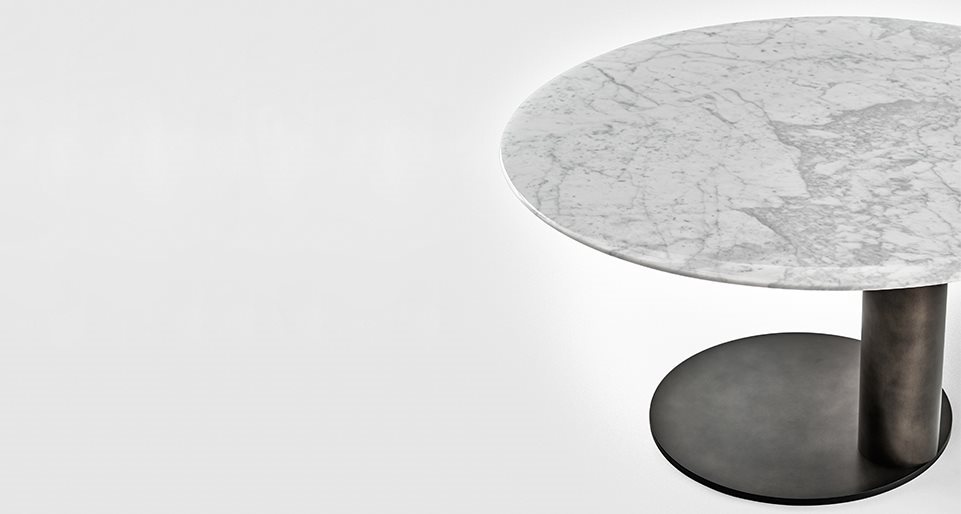 Tavolo con piano in marmo 20mm Bianco Carrara Gioia lucido naturale e struttura in metallo verniciato bronzo antico. Disponibile versione con piano in marmo 20mm Nero Marquinia levigato opaco e struttura in metallo verniciato piombo.