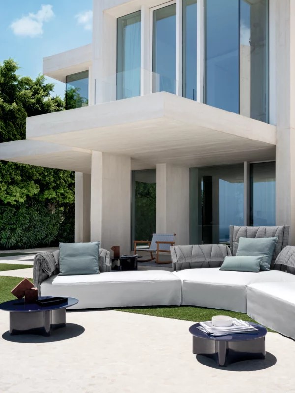 Tavolini bassi, con top tondo con base scultorea in Millgres nei colori Rosso, Bianco e blue.