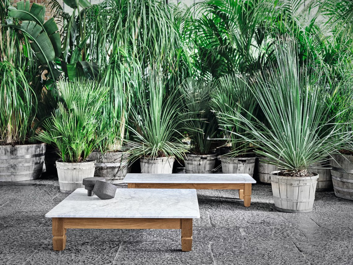 Famiglia di tavolini bassi dalla forma quadrata o rettangolare in stile coloniale di ispirazione esotica, Jeko 11/14 hanno gambe e struttura realizzati in ECOTeak, materiale proveniente dal riutilizzo di travi ed elementi in teak recuperati, riparati con legno riciclato, assemblati e levigati per evidenziare le venature originali. Vengono impreziositi da un top in marmo bianco Carrara, così da creare un prodotto che gioca sui contrasti visivi dei due materiali diversi.
