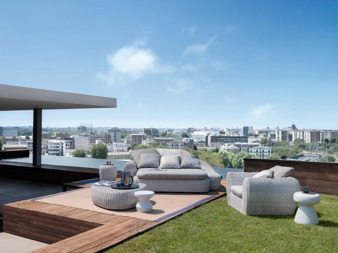 Forma triangolare con angoli arrotondati e volumi pieni caratterizzano il tavolino Panda 11, formato da una struttura e piedini in alluminio ed intreccio in fibra sintetica di polietilene Panda Resin bianco/grigio. Fibre sintetiche di ultima generazione pensate per resistere all’acqua e alla luce e per mantenere nel tempo le qualità tecniche e cromatiche, mantengono un aspetto molto naturale e durevole.