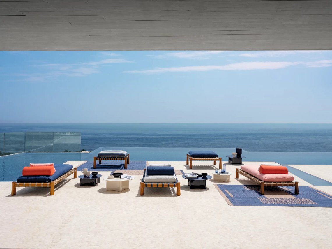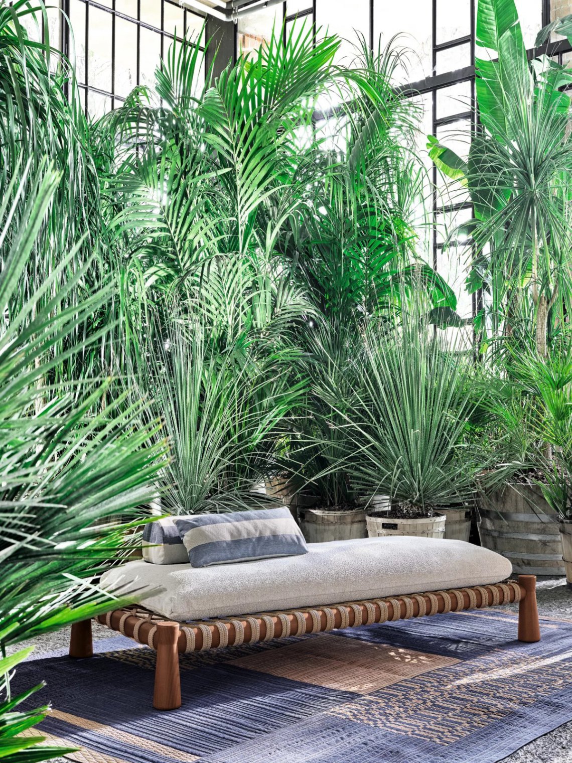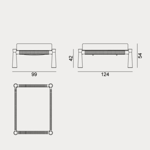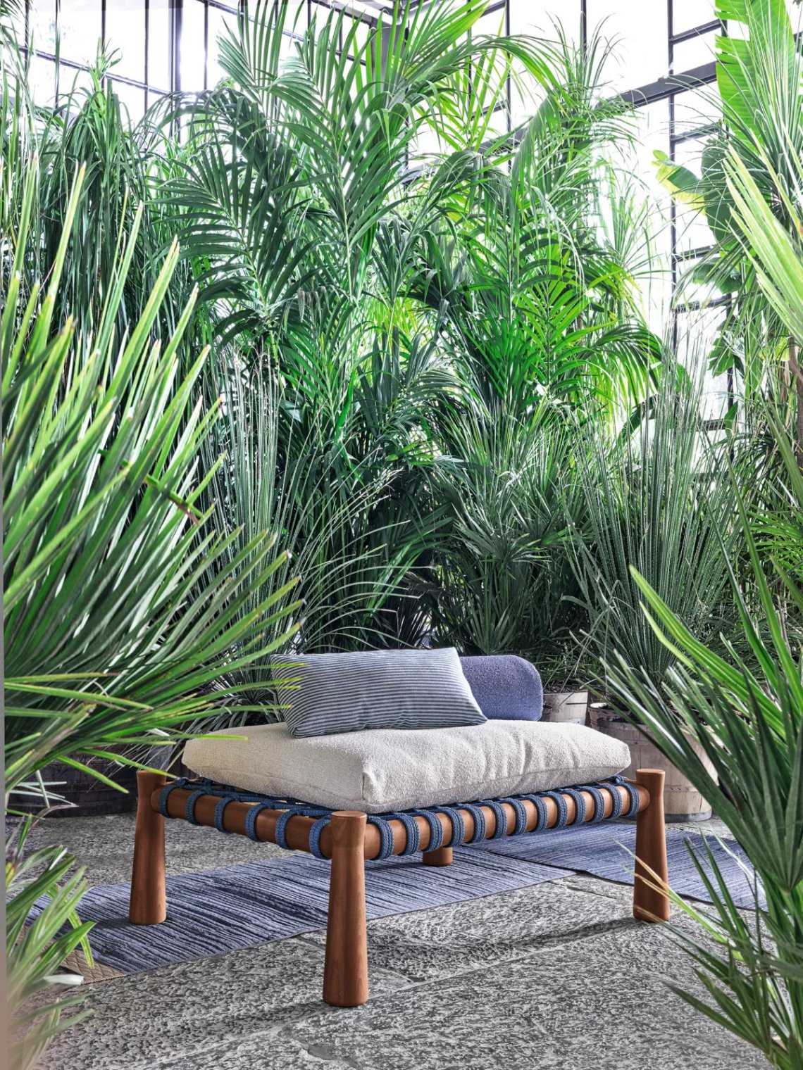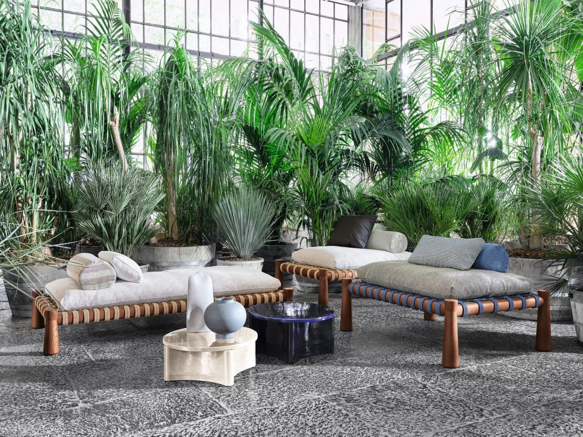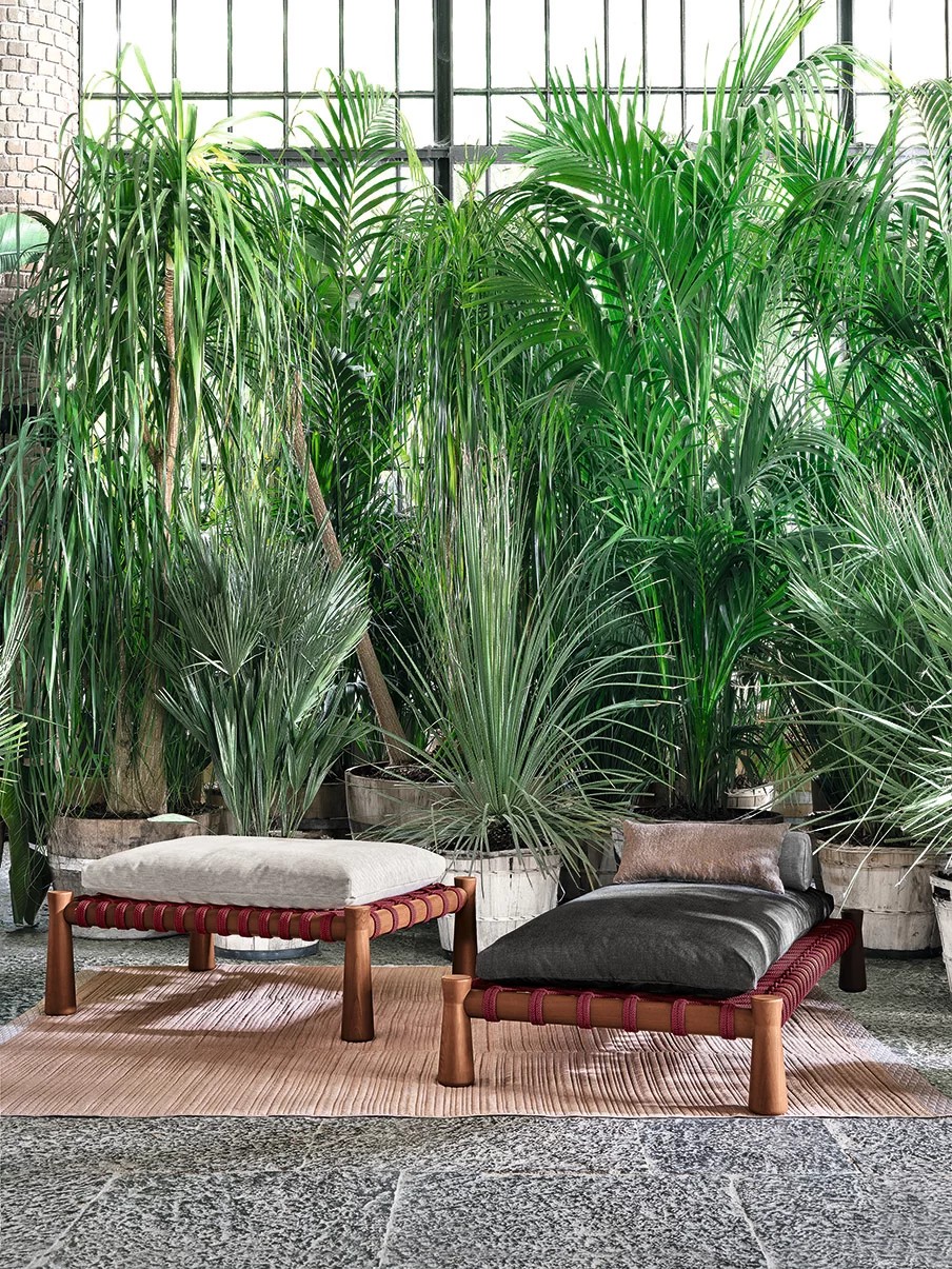 Tradizionale lettino indiano dalle proporzioni basse e ampie, il charpoy viene reinterpretato da Chiara Andreatti attraverso l’utilizzo di corde nautiche color Natural, Red e Blue, intrecciate manualmente alla struttura in legno di Iroko trattato per outdoor, caratterizzata dal particolare disegno svasato delle gambe, su cui poggiano cuscini di seduta. Disponibile in due misure 195x95 e 120x100 per movimentare lo spazio.