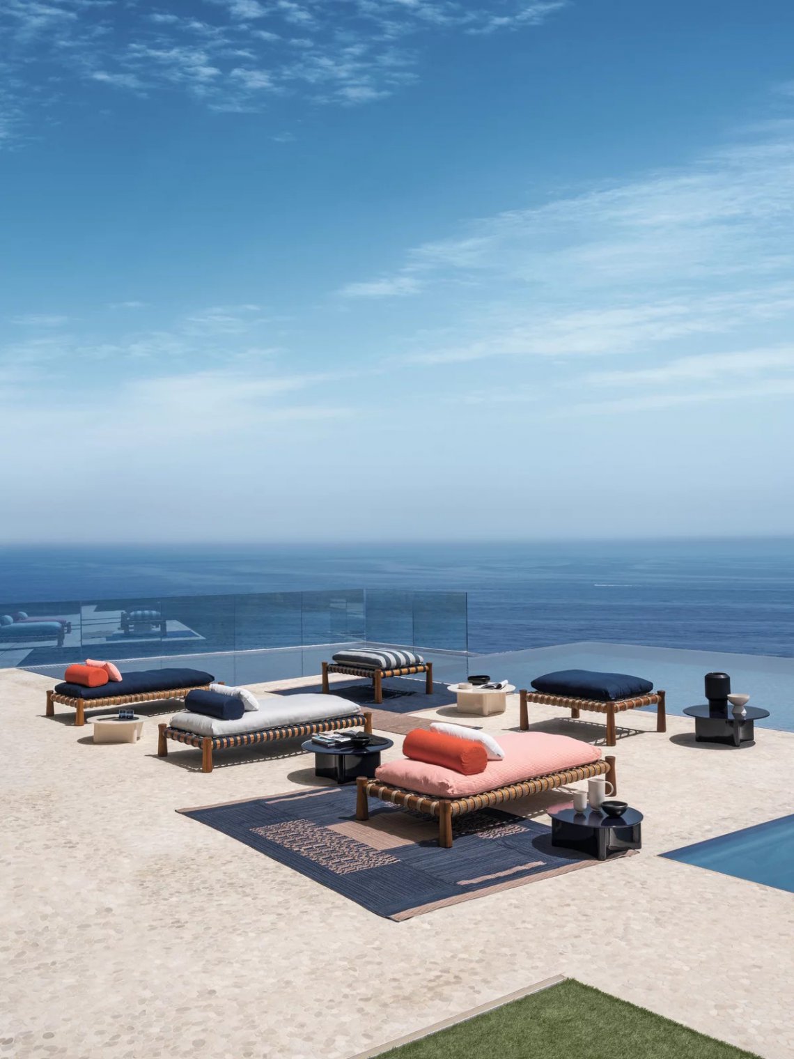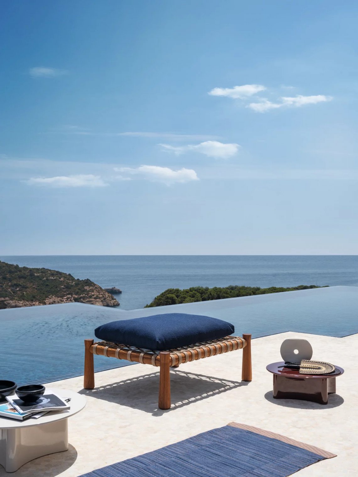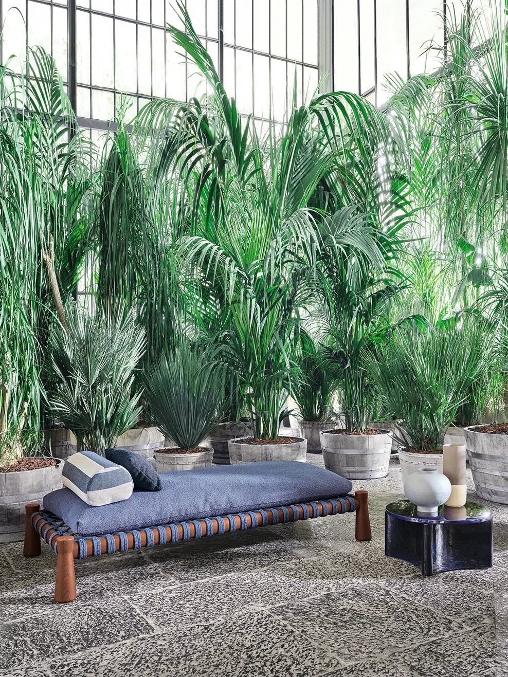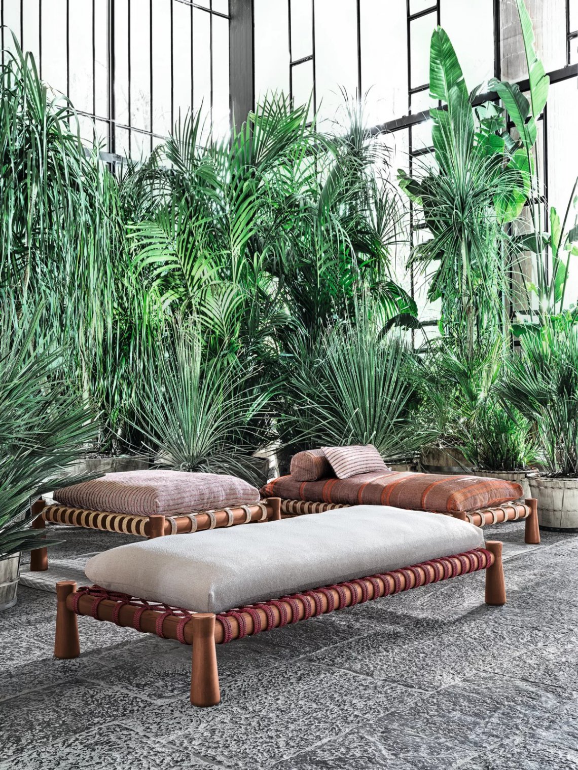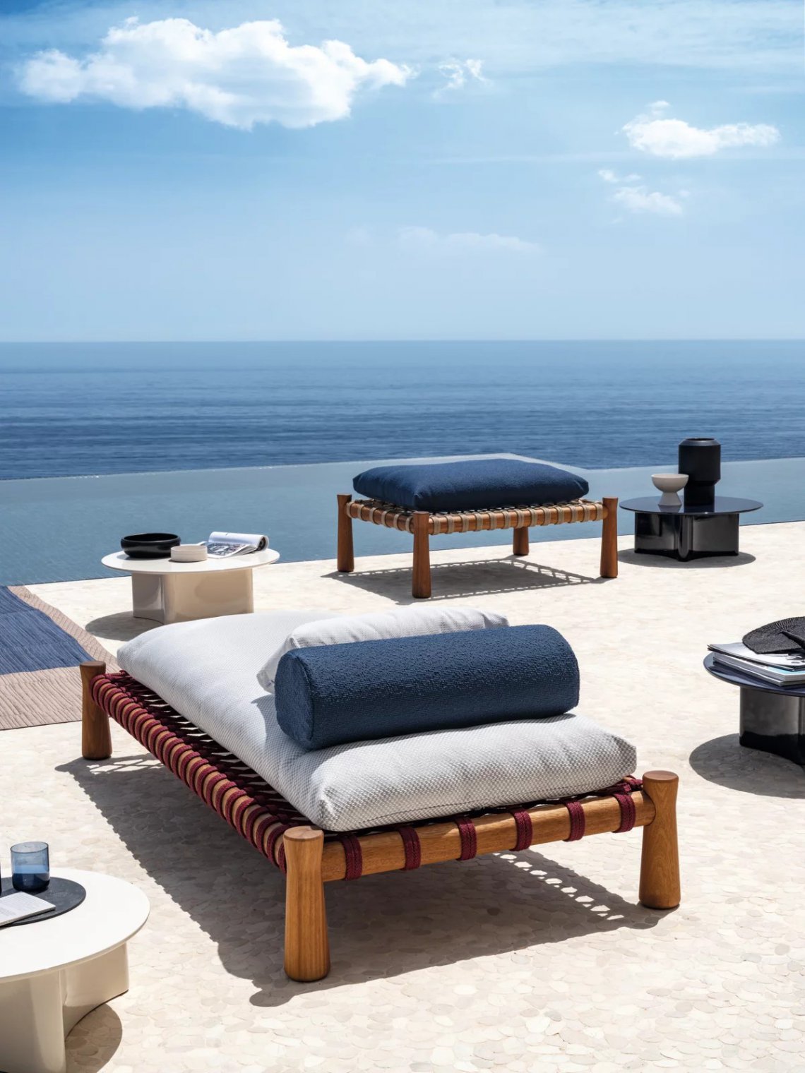Tradizionale lettino indiano dalle proporzioni basse e ampie, il charpoy viene reinterpretato da Chiara Andreatti attraverso l’utilizzo di corde nautiche color Natural, Red e Blue, intrecciate manualmente alla struttura in legno di Iroko trattato per outdoor, caratterizzata dal particolare disegno svasato delle gambe, su cui poggiano cuscini di seduta. Disponibile in due misure 195x95 e 120x100 per movimentare lo spazio.