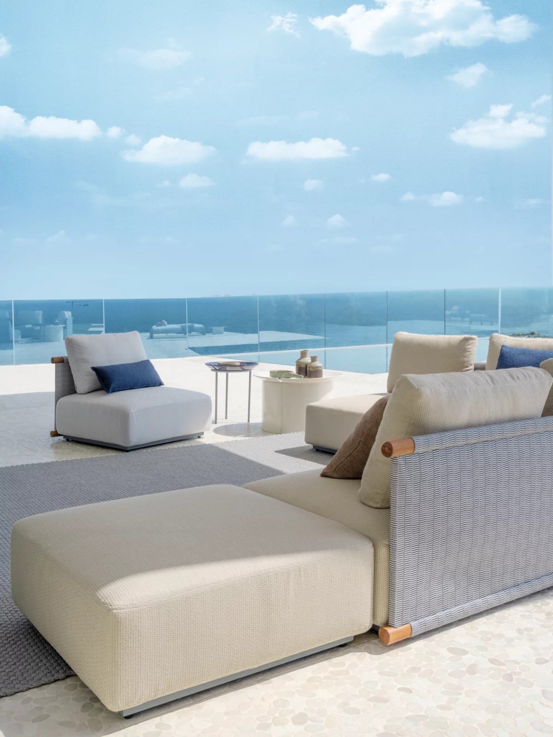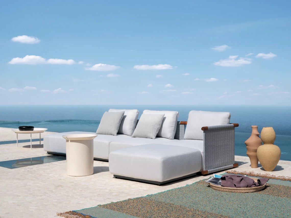 Letteralmente “bacchette” in giapponese, il divano modulare Hashi ha un sistema con struttura minimale e rigida che ricorda lo strumento orientale da cui prende il nome. I diversi moduli del divano sono resi confortevoli grazie ai cuscini di seduta in poliuretano espanso a densità variabile e fibre poliestere, rivestiti con telina poliestere outdoor e fondo traspirante antiscivolo con la struttura della base e dei telai degli schienali in acciaio trattato per l’esterno.