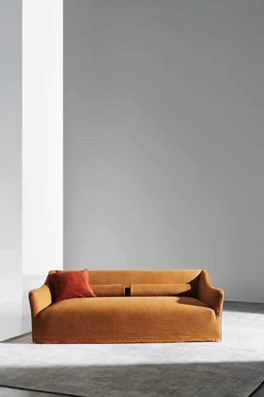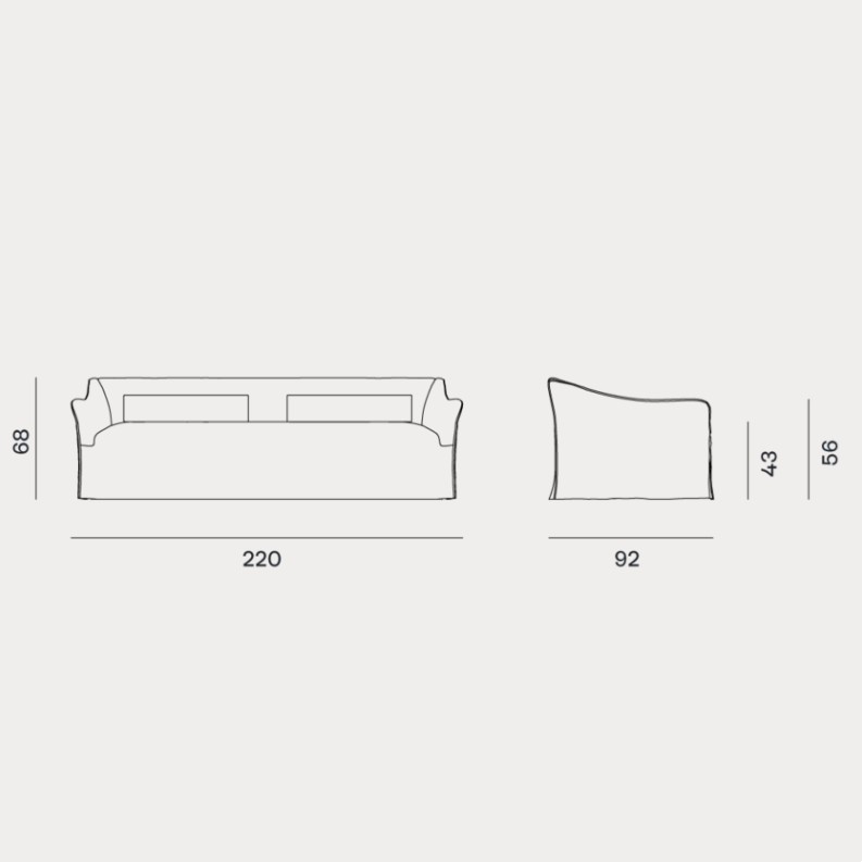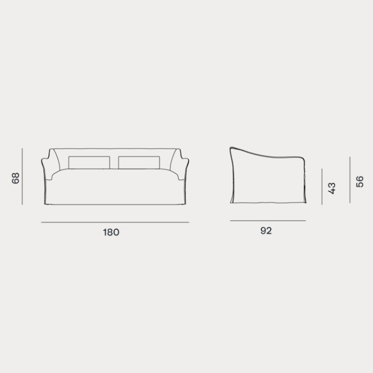 Divano con imbottitura in poliuretano a densità differenziata. La seduta ha un inserto a molle insacchettate al fine di migliorarne comfort, sofficità e durata. Cuscini volanti a rullo in piuma. Rivestimento sfoderabile con piping. Disponibile in tutti i tessuti di campionario eccetto 3D, Quilt Malta e Quilt Velour.
