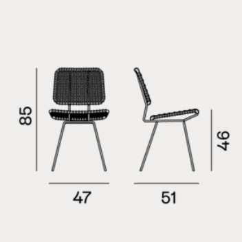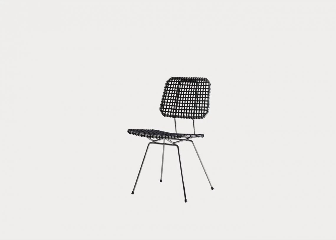 La sedia Brick 23 senza braccioli, ha una struttura in tondino di acciaio cromato lucido. Linee leggere e spessori sottili sono enfatizzati dall’intreccio in pergamena grigia della seduta e dello schienale.