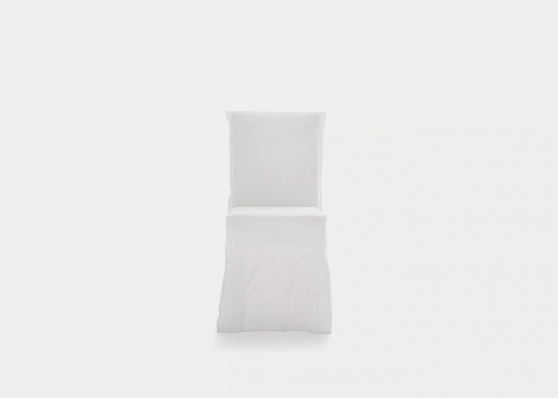 Sedie con e senza braccioli, hanno una struttura minimale, con forme geometriche pulite e definite. La famiglia di sedie Ghost ha una struttura in legno che si unisce a imbottiture in poliuretano espanso. La caratteristica principale delle sedie Ghost è il rivestimento sfoderabile, una housse oversize il cui profilo è sottolineato dalle cuciture a vista, che permette ai prodotti di svestirsi e rivestirsi in un baleno. Si tratta di un progetto tessile che cambia facilmente volto, permettendo di passare da un look formale ad uno informale con facilità e velocità.