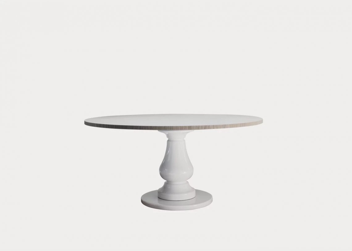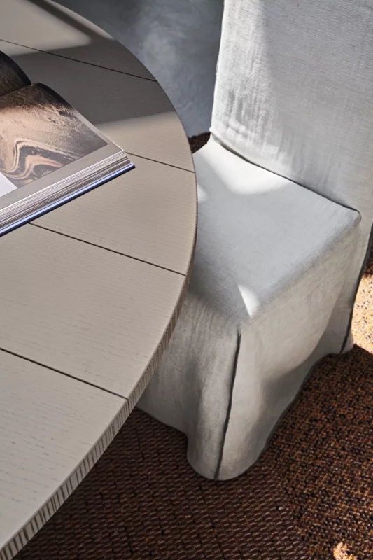 Il tavolo GRAY 38 è caratterizzato da un perfetto equilibrio tra materiali diversi, per una proposta dallo spirito trasformista. La gamba centrale scultorea in gres bianco, elegantemente tornita, può essere abbinata a un top a doghe in noce o rovere disponibile nei colori di collezione o in marmo bianco Carrara.