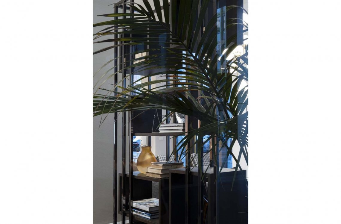 Geometries and chromatic games distinguish the iconic Mackintosh double-sided bookcase, a contemporary piece of furniture with decorative allure, worthy of a starring role in any living space. Proposed in a new version that combines the black chrome of the structure with the smoky grey Tay wood of the cubes, the bookcase characterizes the setting with its bold charm.