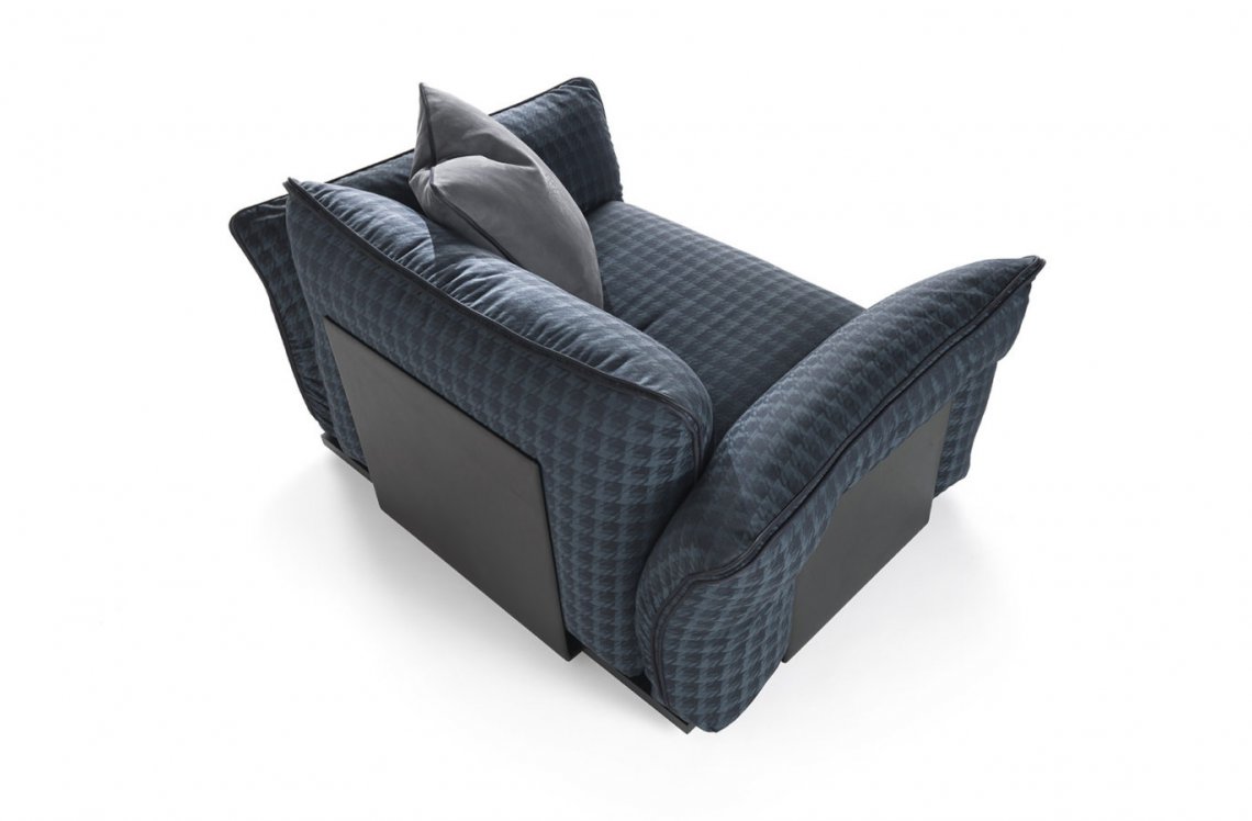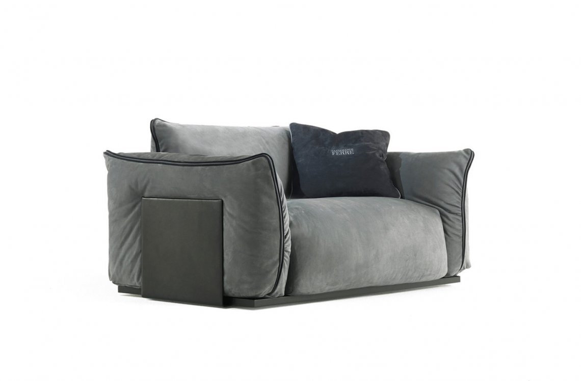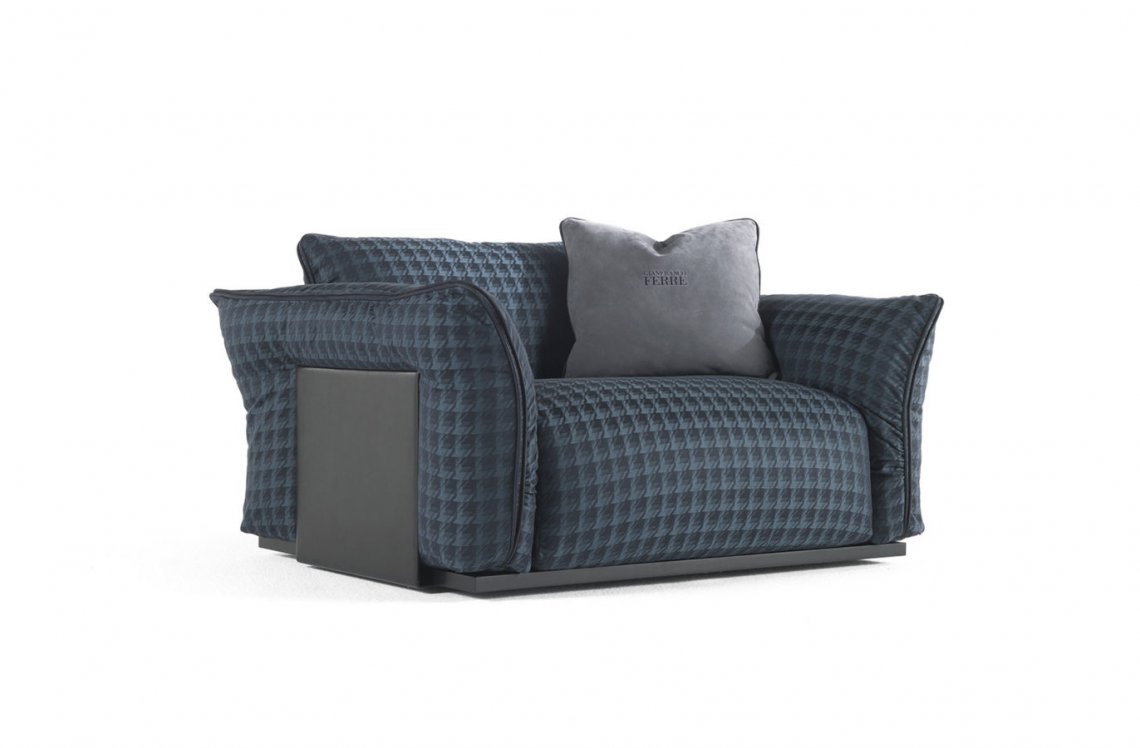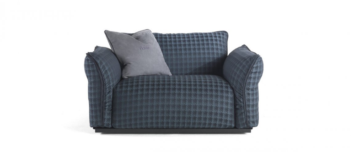 An attractive armchair with a comfortable seat and a contemporary design. The geometric volumes are emphasized by the external plates in metal upholstered in leather and by the piping in the same material. The upholstery in fabrics inspired by men's fashion further enhances the urban charm of the sofa, giving it a touch deeply in line with the identity of Gianfranco Ferré Home.