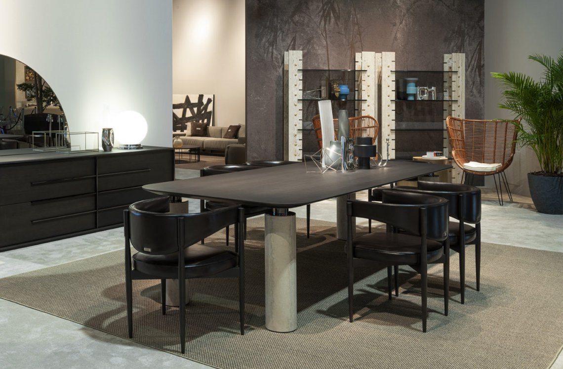 A slender and light structure, with tapered legs and a dynamically shaped backrest for the Harlem chair. In the name there is a reference to the famous district of New York, renowned for its jazz clubs and historic soul clubs. The leather upholstery and the smoke grey-stained wood structure enhance its contemporary appeal, making it perfect for creating settings with a metropolitan atmosphere.