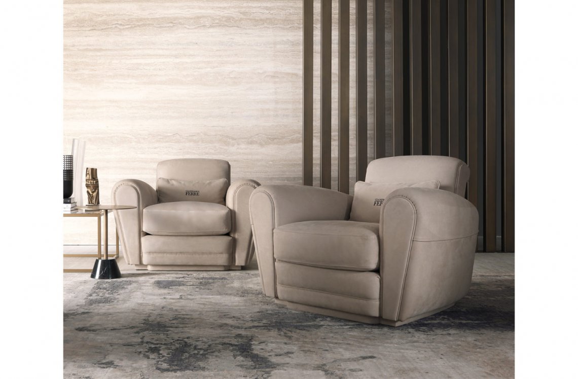 A piece of furniture that wisely mixes a vaguely retro taste and details in contemporary style. The enveloping lines and the leather upholstery offer a pleasant sensation of welcoming warmth, while the flawless tailoring underscores the high level of expertise and masterful craftsmanship of the brand.