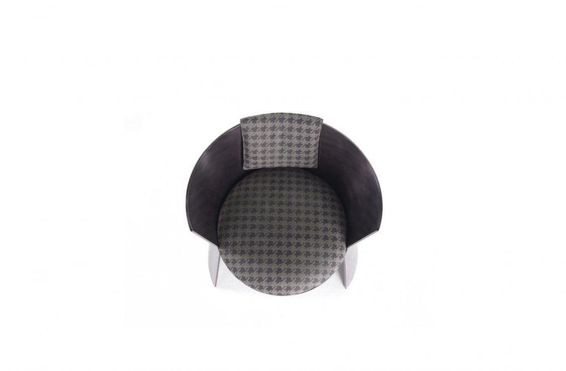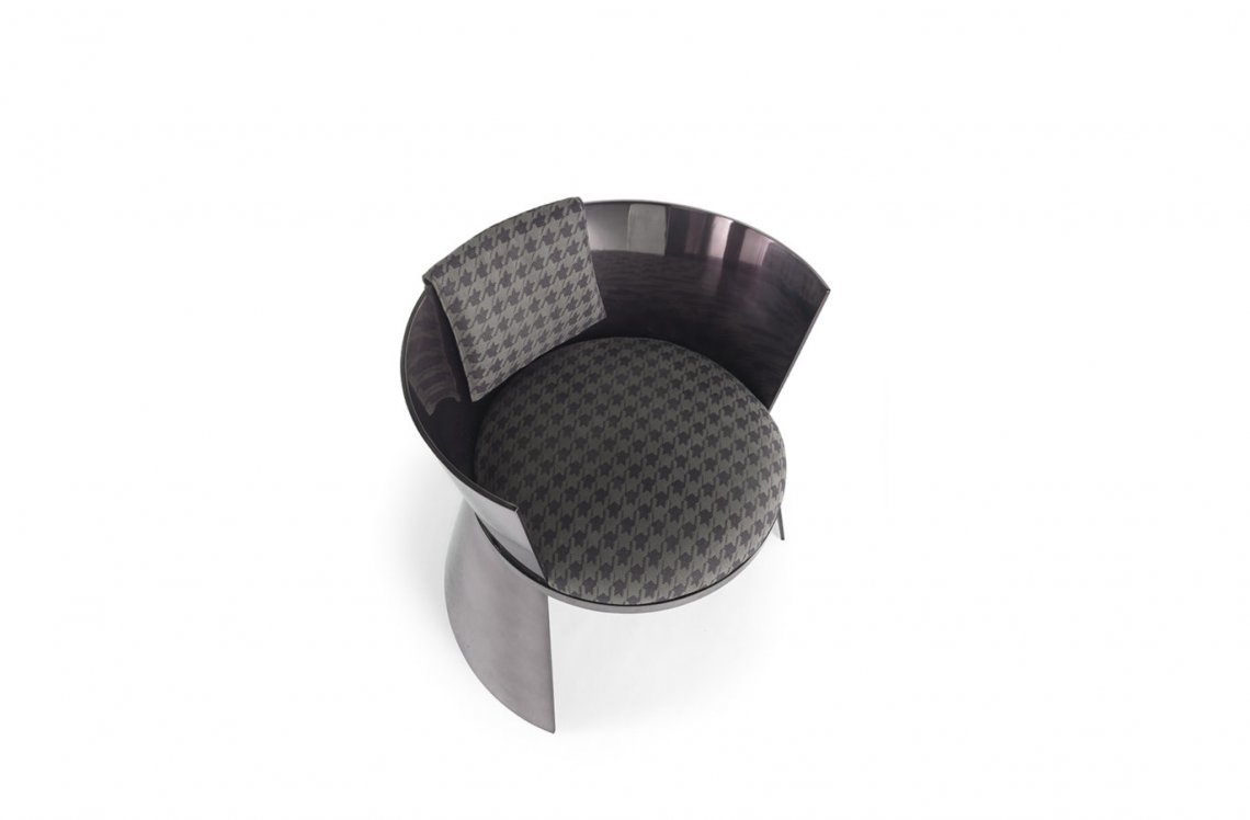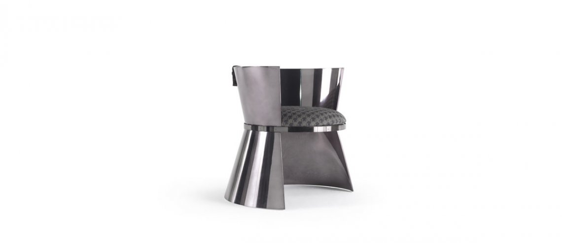 An original hourglass-shaped armchair, characterized by the alternation of components with chrome-plated and glossy finish. The seat cover with houndstooth leather adds a masculine note to this urban and metropolitan piece of furniture.