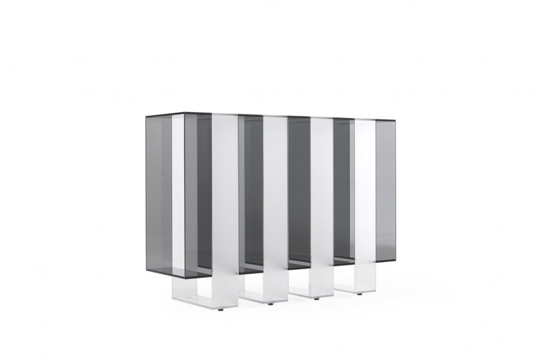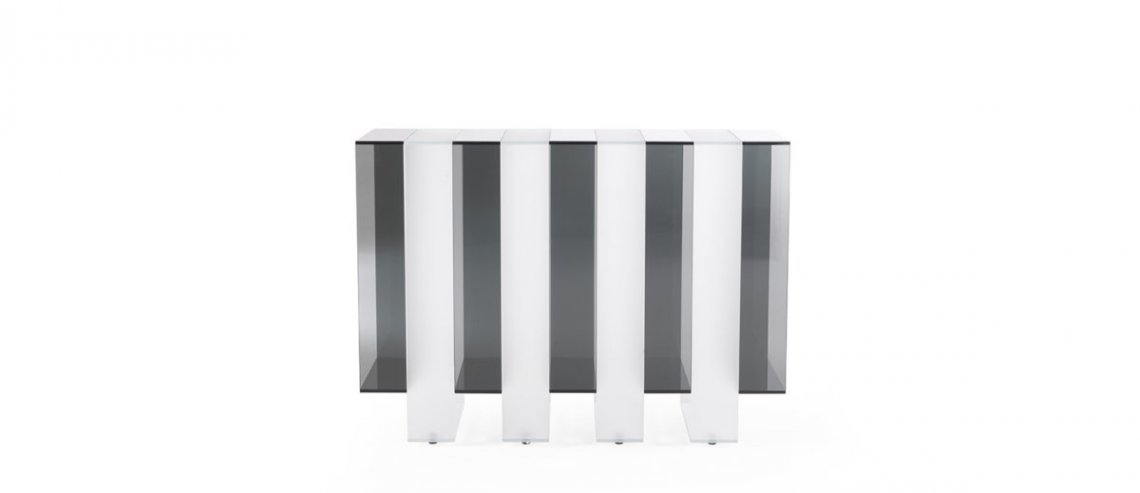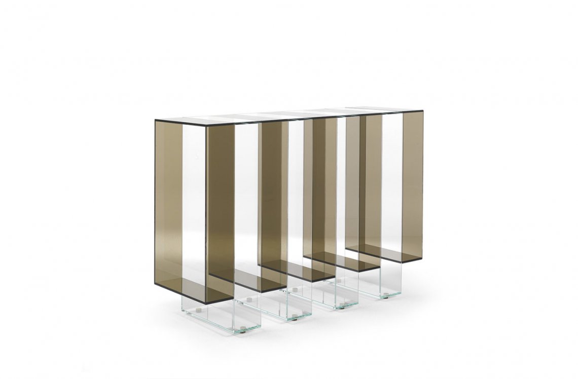 Pure volumes and essential lines: these are the main features of the Jenga console. A composition with a refined design that is expressed in the succession of light and dark glass rectangles, assembled at 45° and joined without showing grafts or joints. The entire structure is made of glass and the whole piece is revealed to the eye as a unique light and refined block. In a surprising game of colors and geometries, the combination of light and dark glass is reinterpreted this year in a new chromatic palette, combining satin extra-clear and smoky glass.