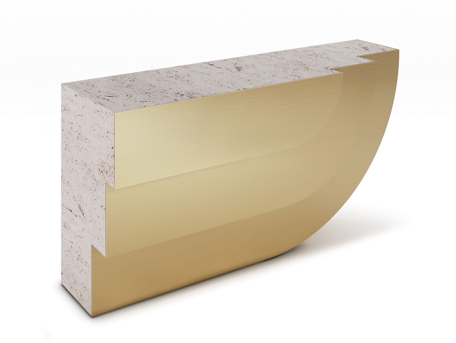 Fossils are testaments of the passing of millennia, geological mementos of the cycles of life. The Fossil Console is a tribute to this natural mechanism of the Earth, with its layered features and coalescence of materials. The design is harmonious and creates an organized atmosphere, standing in a remarkable balance as a standalone statement piece, or next to a wall.