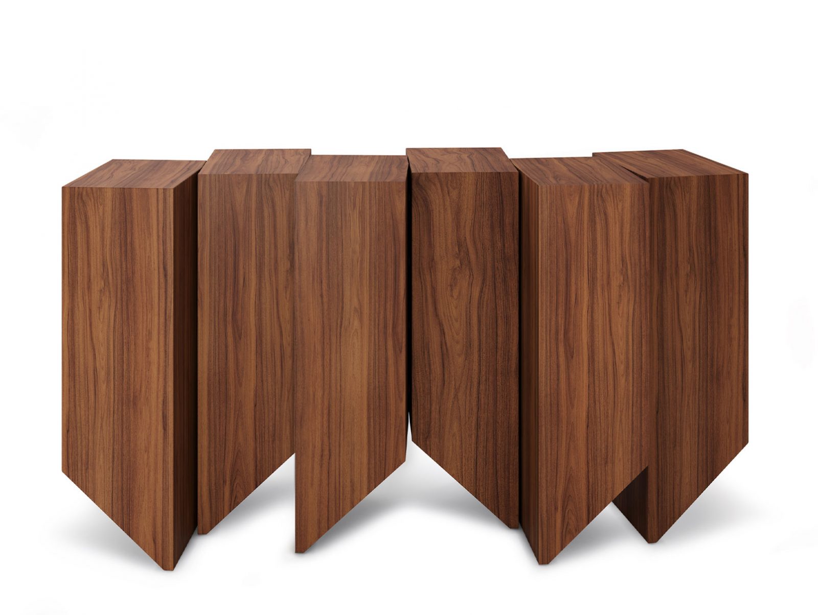 The Geode Console is reminiscent of deep ridges and mineral formations. The earth-like natural variation of the materials of each section make each design unique, threading the needle between function and art. The sculptural and geometric nature of the Geode is perceivable through its layered composition, minute details and angles.