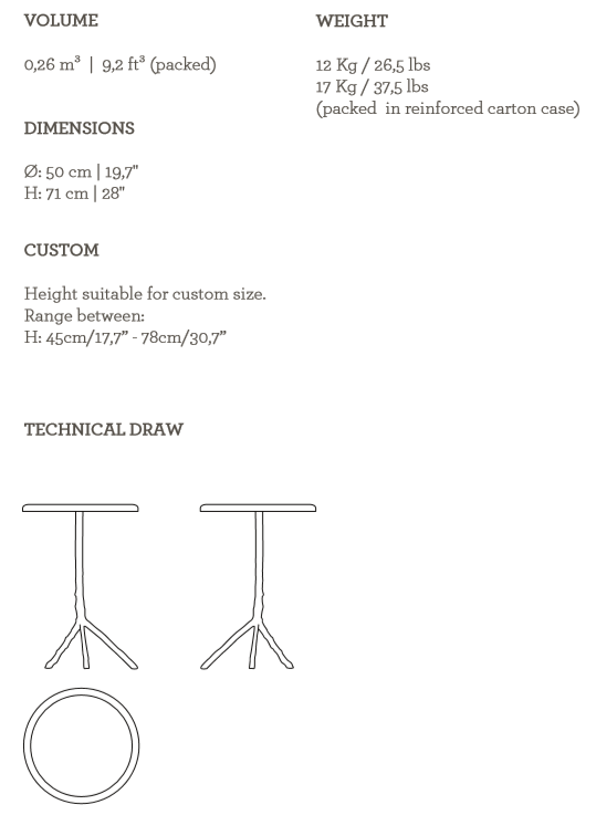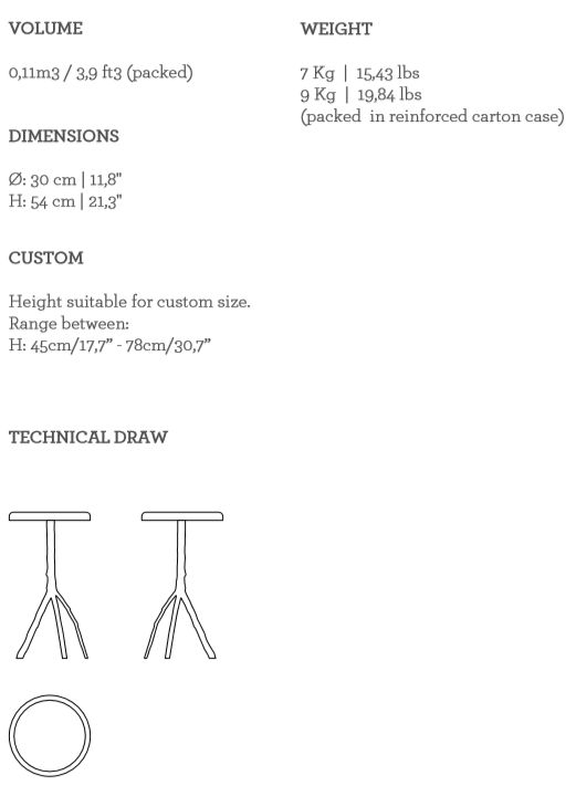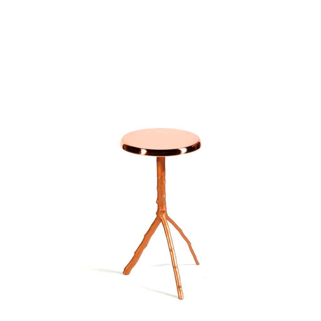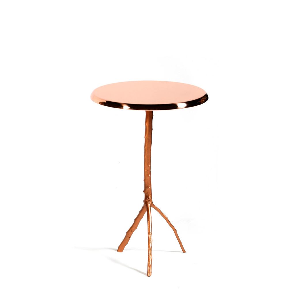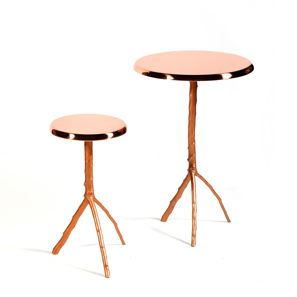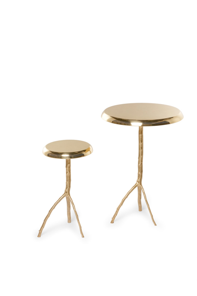 The sculptural legs of the Embrace Side Tables are made from fig tree branches, eternalized in brass casting mold, with a simple but striking top.