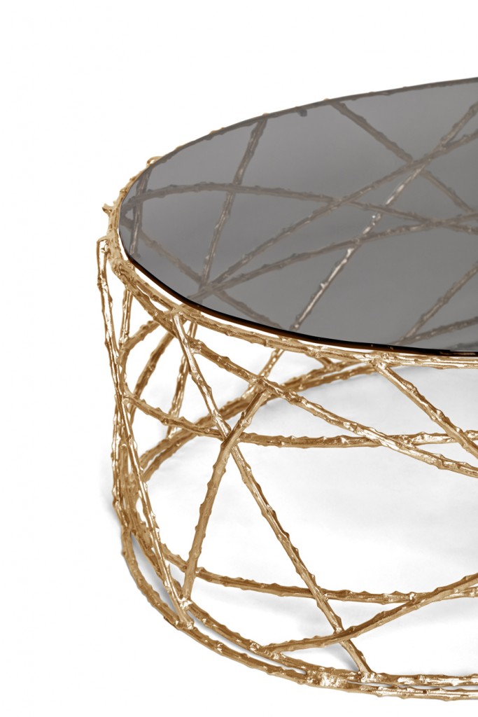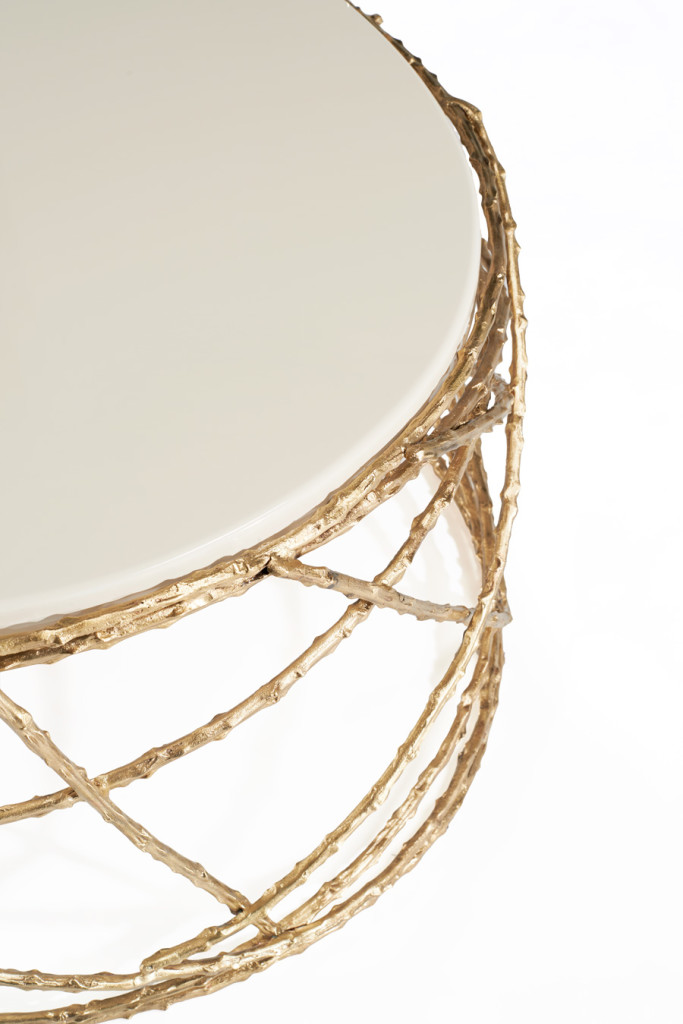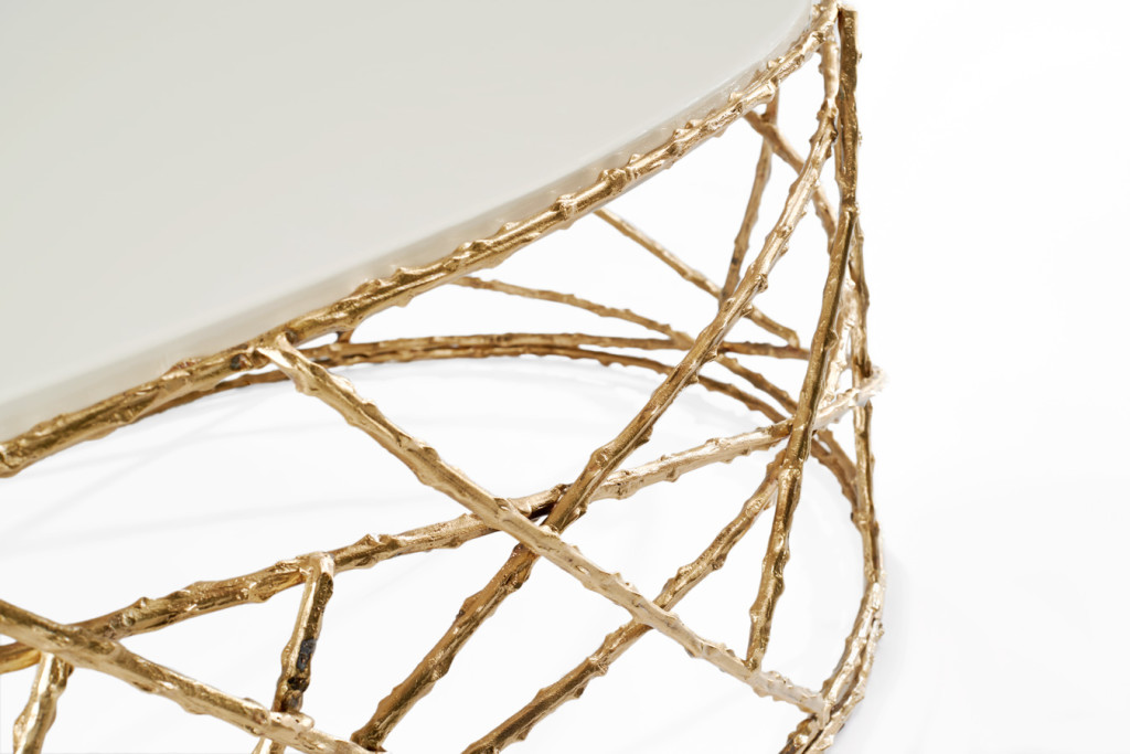Eternalized rosebush branches, molded in brass casting, give a perennial feel to this elegant table. The bottom structure is assembled by hand by artisans, while the minimalistic top offers a soothing and quiet balance to this piece.