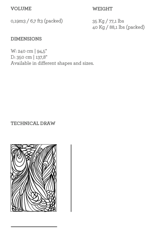 The Eden Rug is inspired by lush gardens, drawing from the shapes and lines of feathers, leaves and animal scales. This cornucopia of natural textures and its contrasts bring a sensuous feel to its surrounding space.