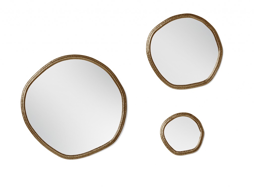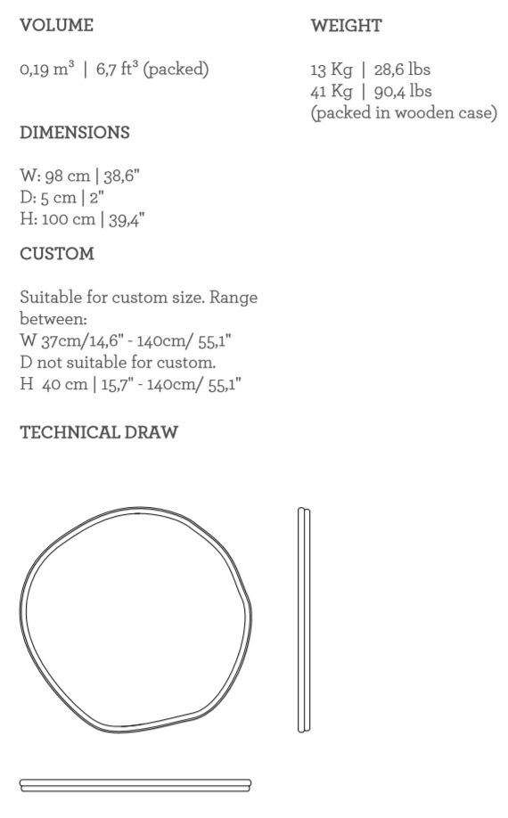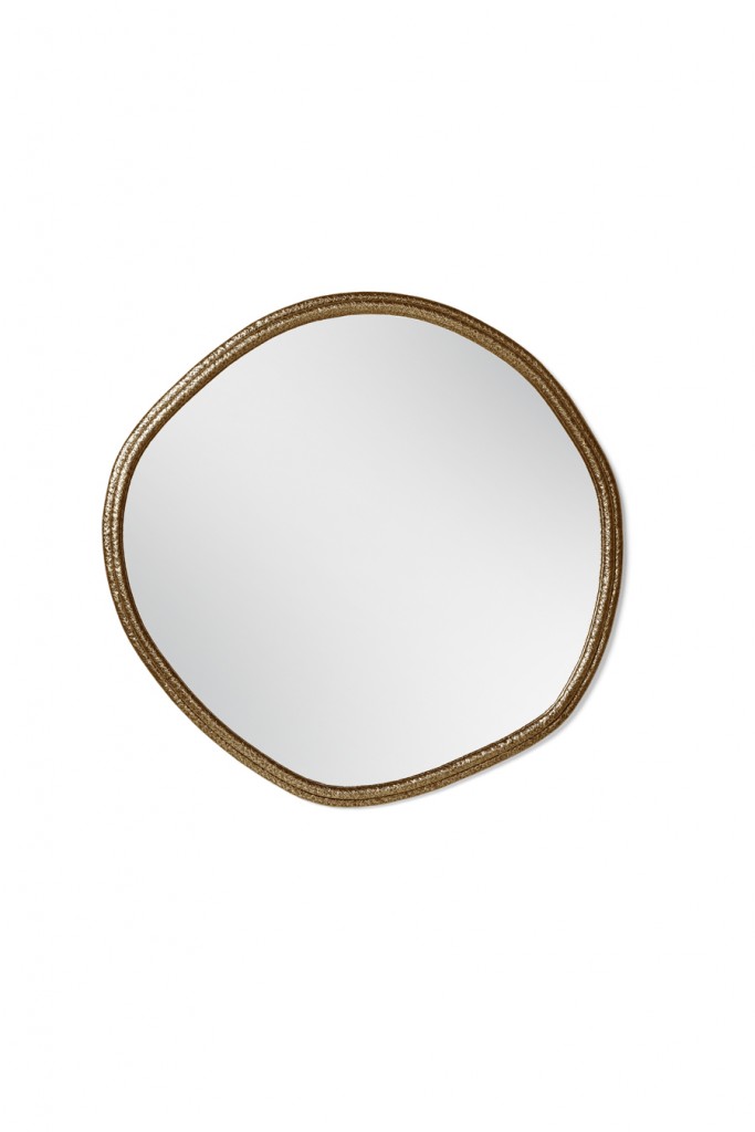 A tree’s core is a testament of the vital force of Nature, a realm where nothing is lost, all is merely transformed. The arches of this mirror are hand hammered in brass, shaped around a tree trunk. The mirror here represents time as a flat quasi-elliptical shape, therefore everlasting.
