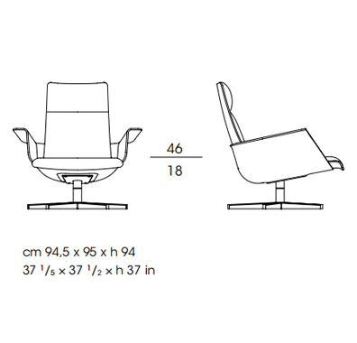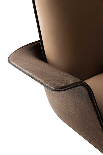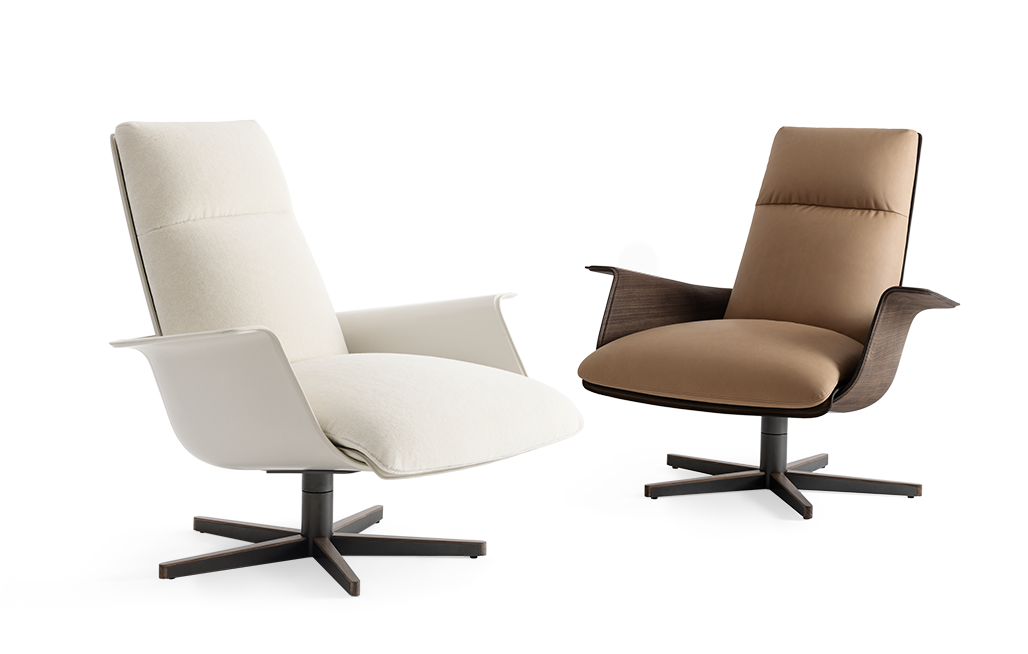 Swivel armchair with ottoman with enveloping shapes for an innovative comfort experience.