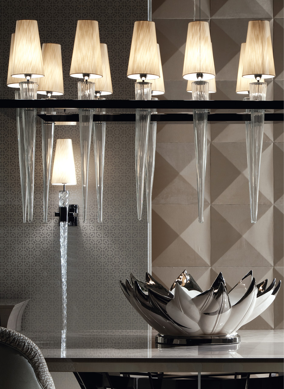 Wall ligth in combination of "Murano" blown glass and stainless steel in storm dark grey finish. Shade in beige silk.