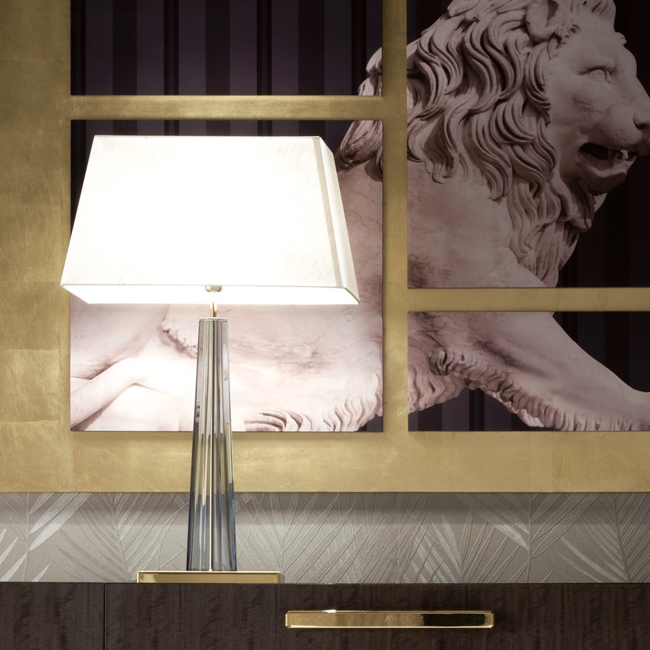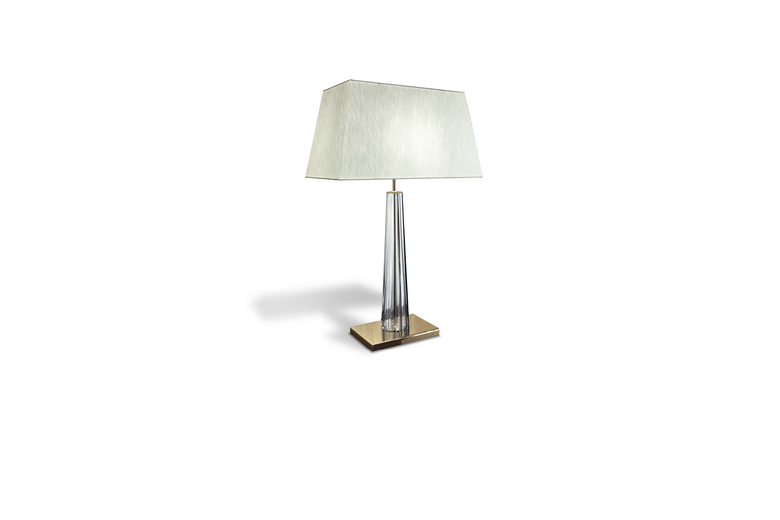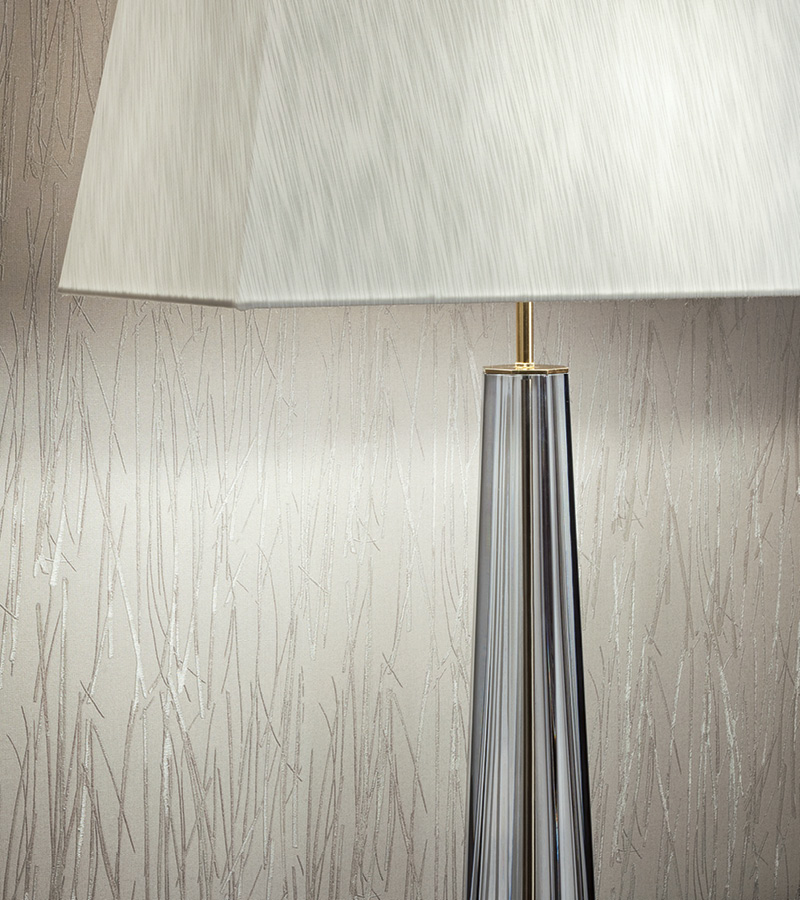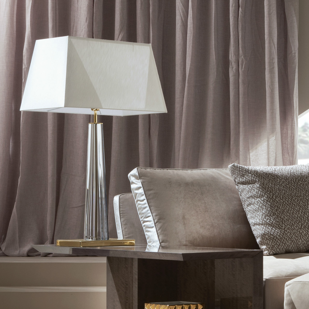 Light gold chrome stainless steel medium lamp, Venetian "Murano" clear blown glass structure. Shade in white silk.
