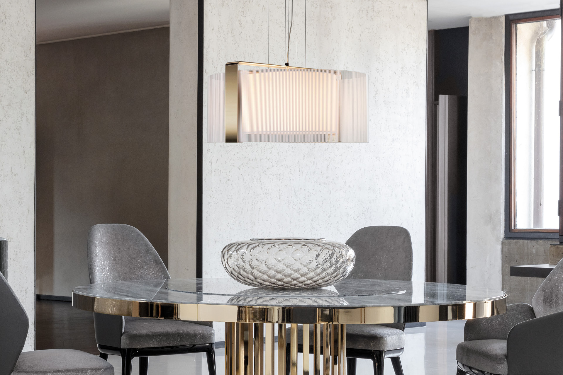 Round chandelier in combination of Venetian streaked "Murano" blown glass and light gold chrome stainless steel structure.