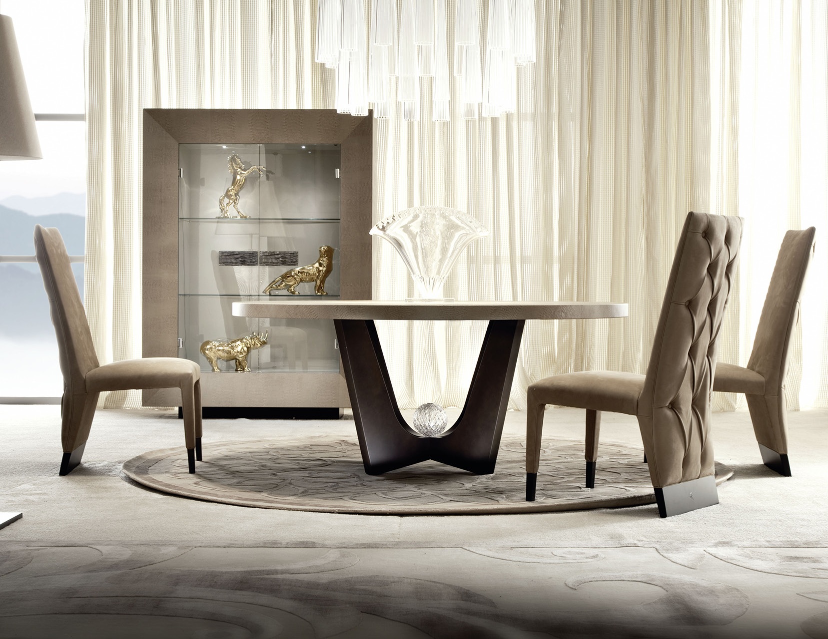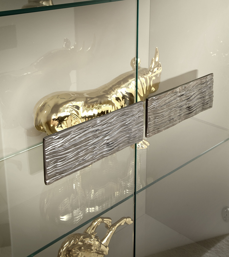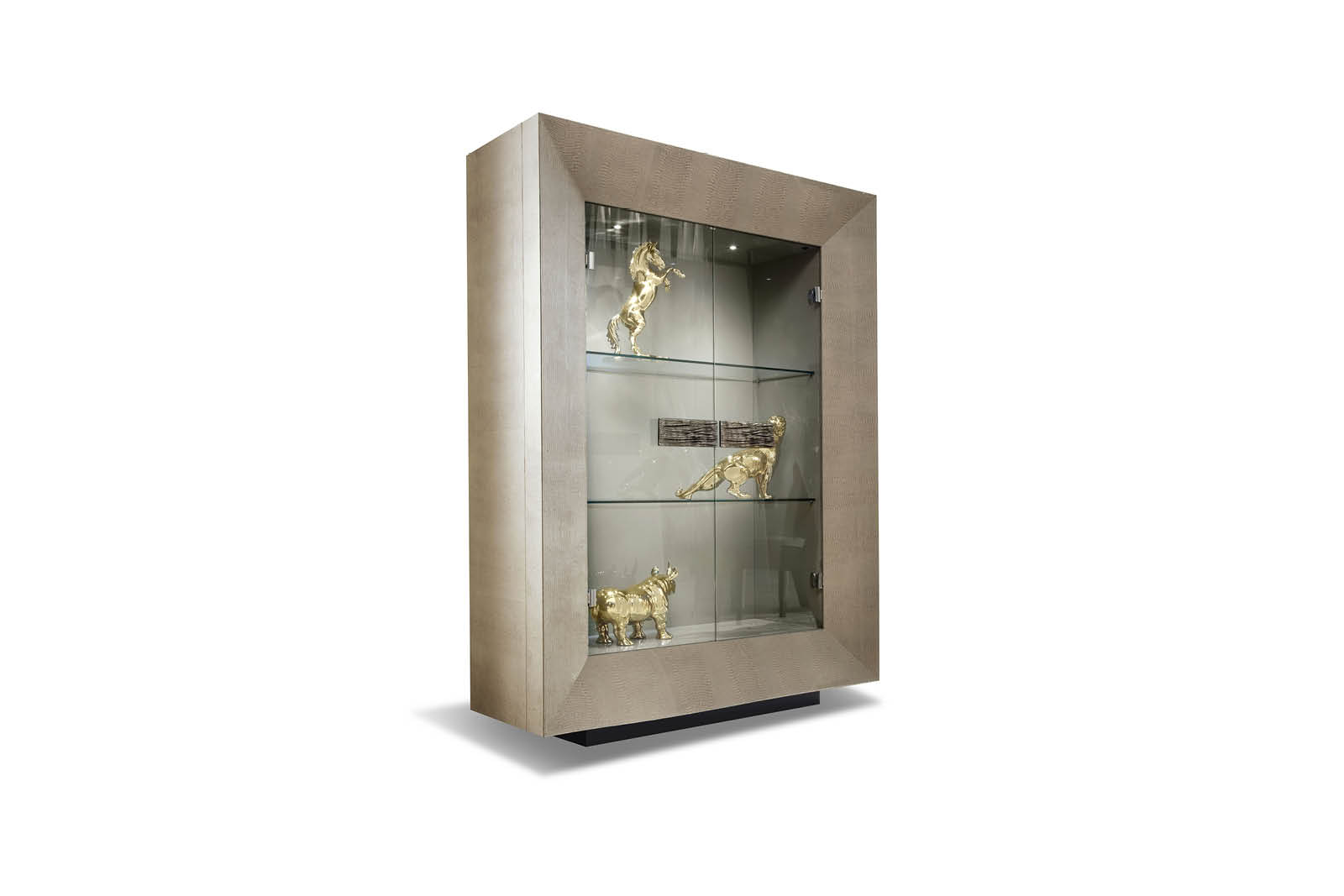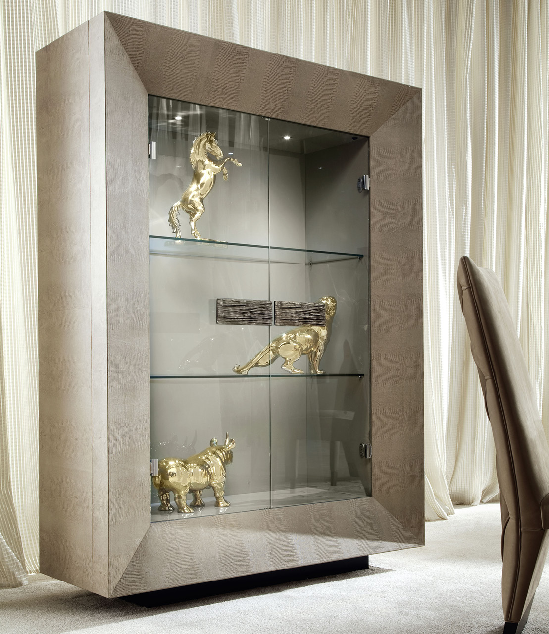 2 glass doors Vetrine in armadillo printed leather with 2 adjustable glass shelves. Side and back panels in high gloss polyester lacquer. 2 halogene led lights including switch. 2 Special bronzed brass handles.