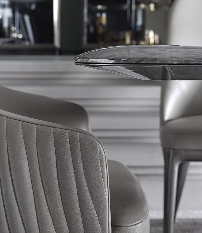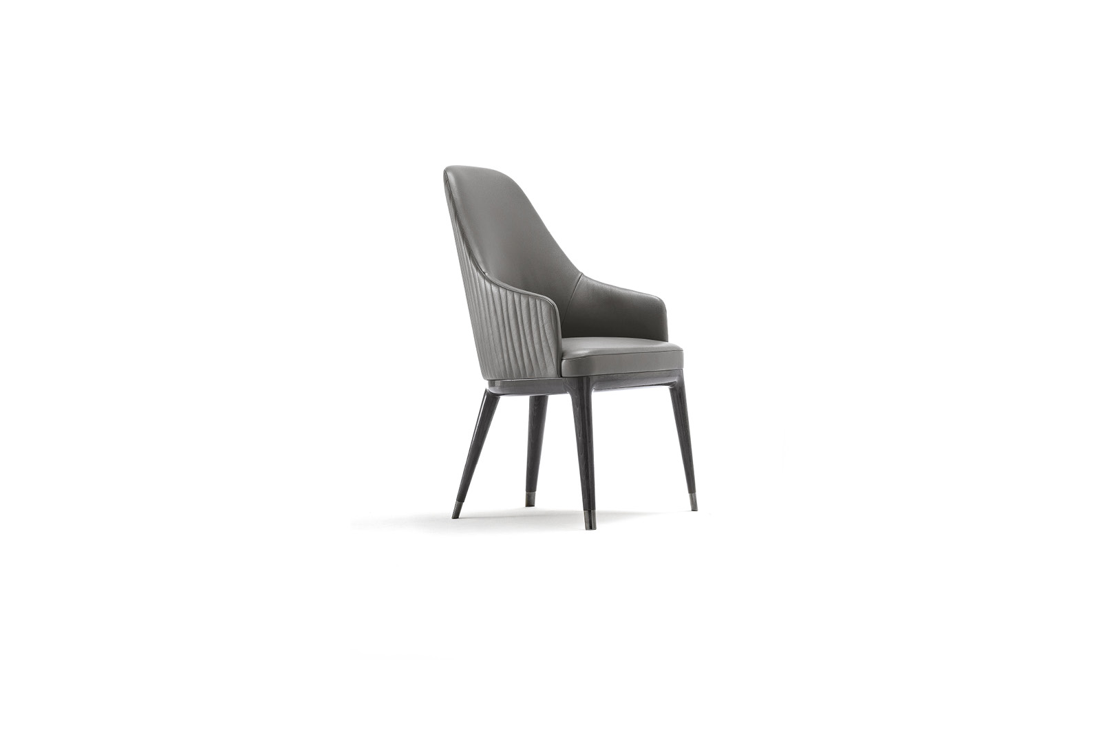 Fully upholstered arm chair in solid beech. Back in quilted first grade leather, nubuk leather, lizard printed leather, velvet or suede fabric. Wooden base with Giorgio Collection logo. 4 legs with details in satin black nickel stainless steel.