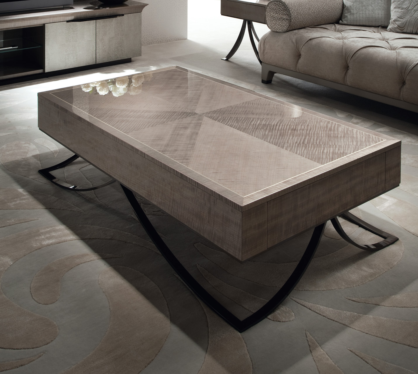 Rectangular cocktail table in tiger African sycomore veneer with high gloss polyester finish. White maple fine line inlay in the top. Base in stainless steel in storm dark grey finish. 2 full extension drawers w/bottom in silver lizard printed leather.
