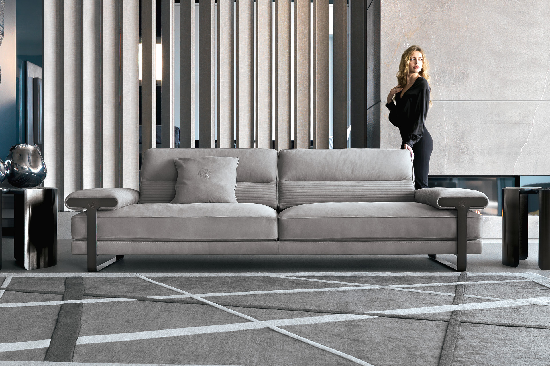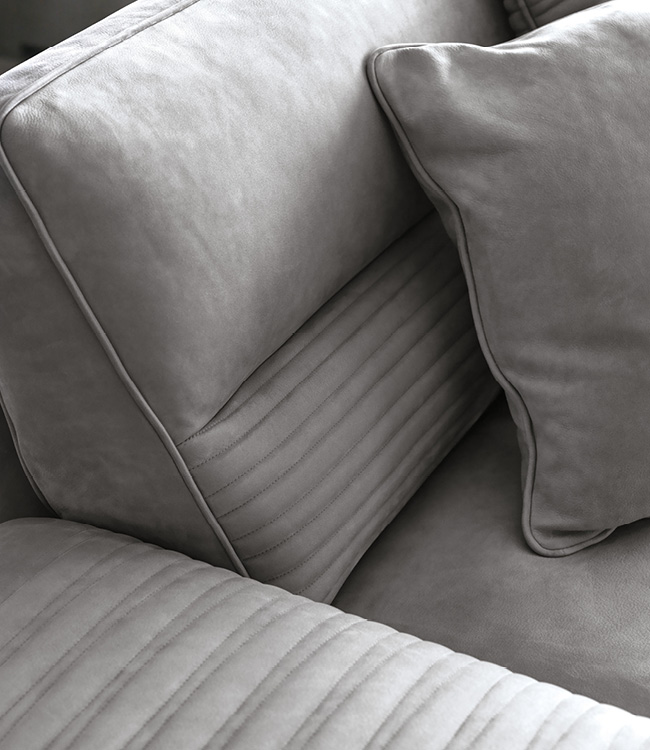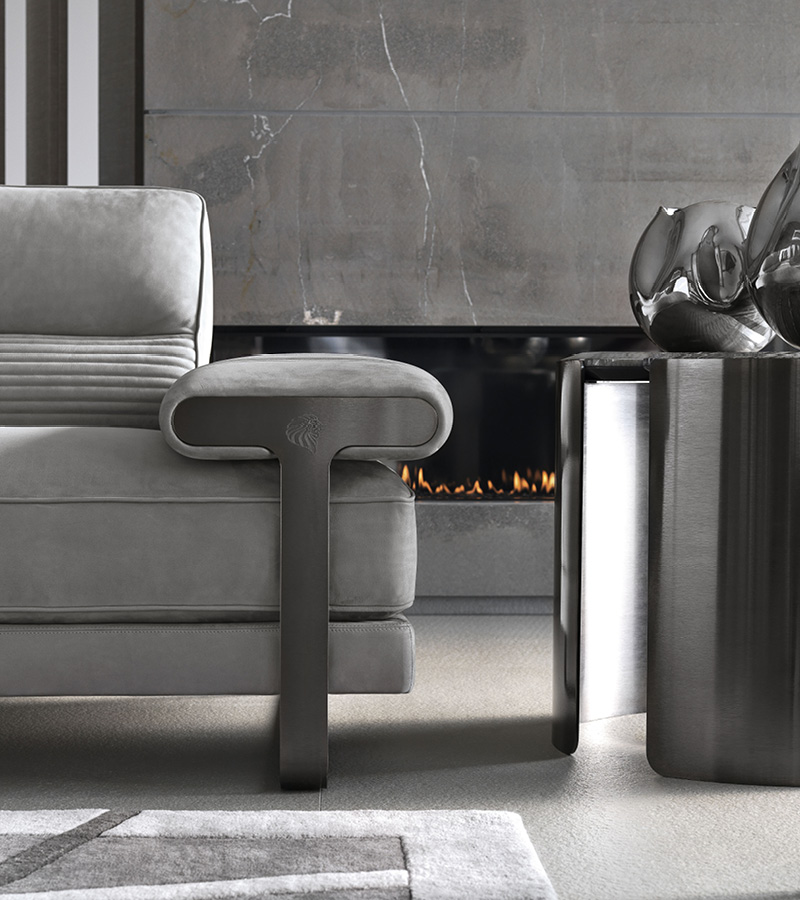 Sofa available in first grade leather, nubuk leather, lizard printed leather, velvet or suede fabric. Sofa seats and sides with special stitching in polyurethane foam wrapped in down feather. Low armrests. Legs and metal trims on the armrests in satin black nickel stainless steel with lasered Giorgio Collection logo.