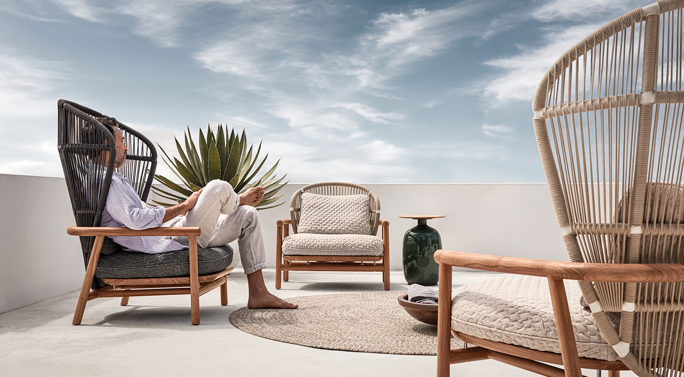 Inspired by the delicate fronds of a unfurling fern leaf, the Fern collection by Sebastian Herkner has a design language that harks back to nature. Combining plantation teak with a soft finish outdoor rope, the enveloping, woven back rest both protects and provides the comfort and is attached to a typically Scandinavian style teak frame, which mirrors its contours and underlines the comfort aspects.