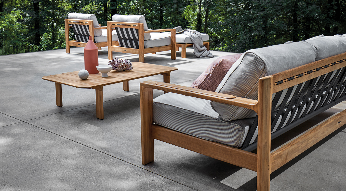 Broad horizontal lines and assertive angles combine to form the bold, indulgent profile of Loop. But Loop is not just about first impressions. Look closer and details can be found that further emphasize Gloster’s reputation for quality and design. Subtle curves add a level of sophistication. Back straps are deliberately wide to unite materials used. And the junction between strap and teak is proudly displayed, creating a confident line that further unites all seating options.