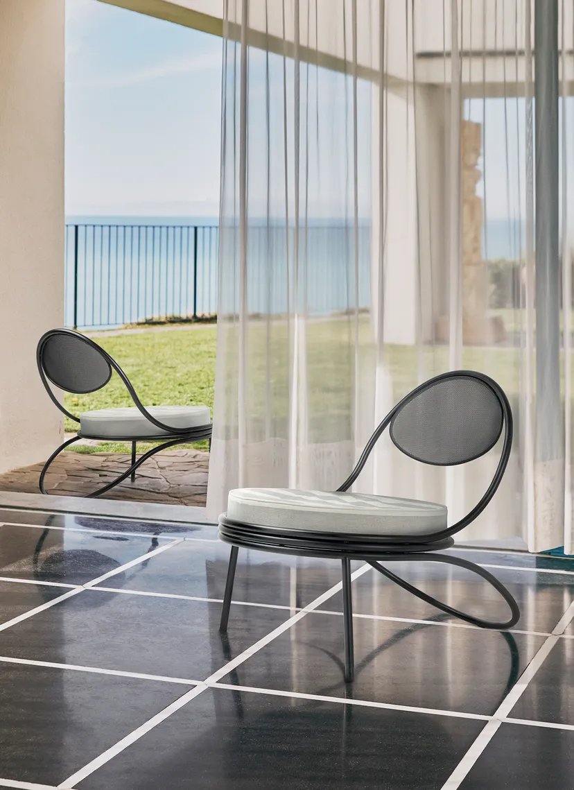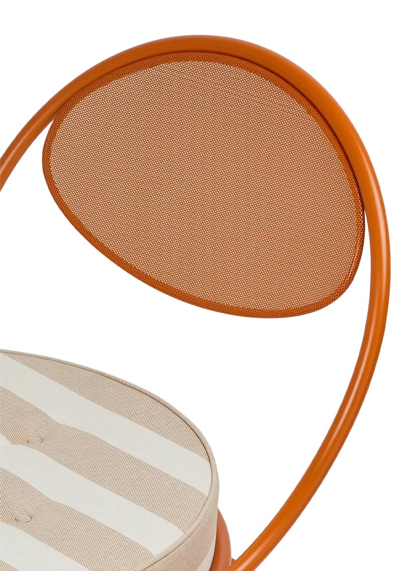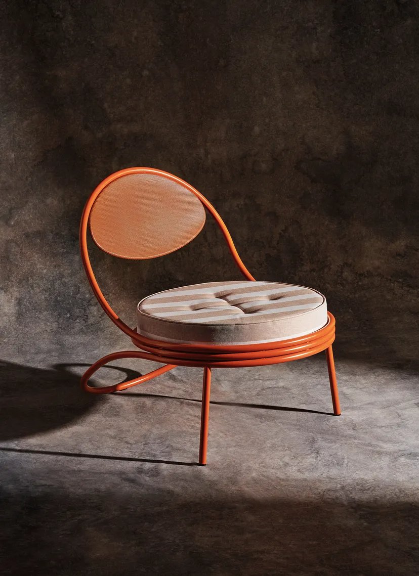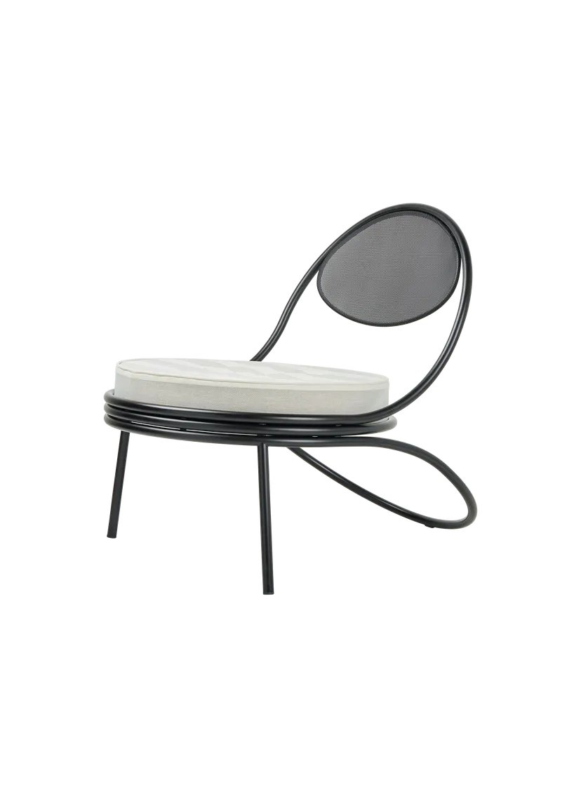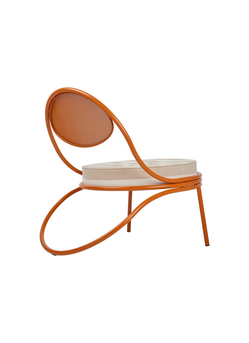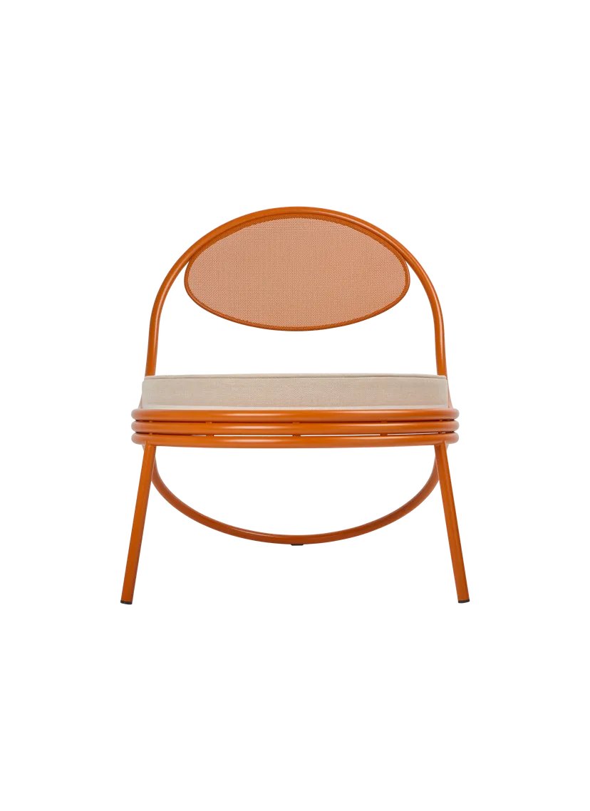 The Copacabana Lounge Chair was created in 1955 by Mathieu Matégot. The low Copacabana Lounge Chair has the impression of being designed with a single pencil stroke and the elegance of the chair resides in the continuous force of the line. It is constructed on the basis of a curved tubular frame that surrounds the round seat and the back made of the perforated metal Rigitulle sheet that often signifies the work of Matégot, ending with the continuous rear legs. The lounge chair, available in black and orange frames, is suitable for both indoor and outdoor use, depending on the fabric upholstery of the seat cushion.