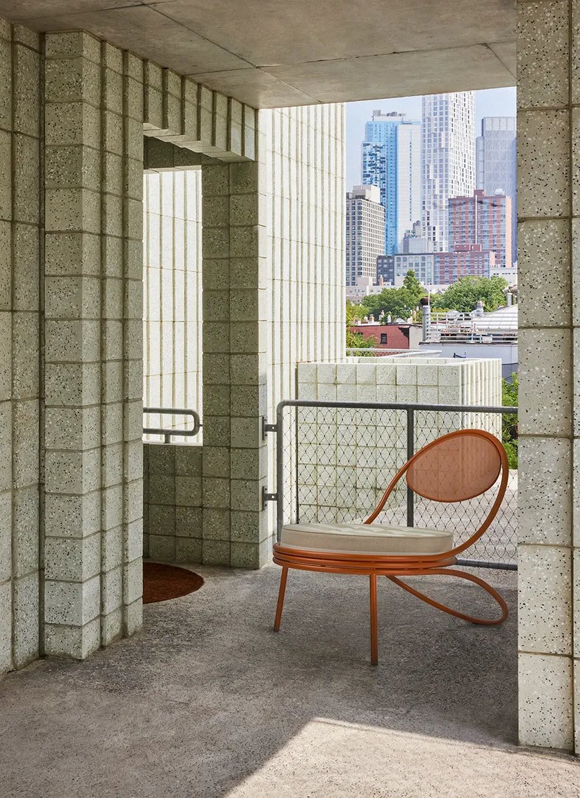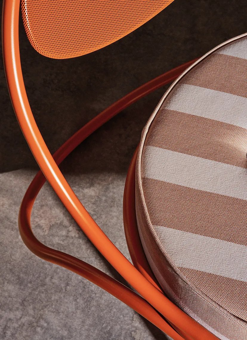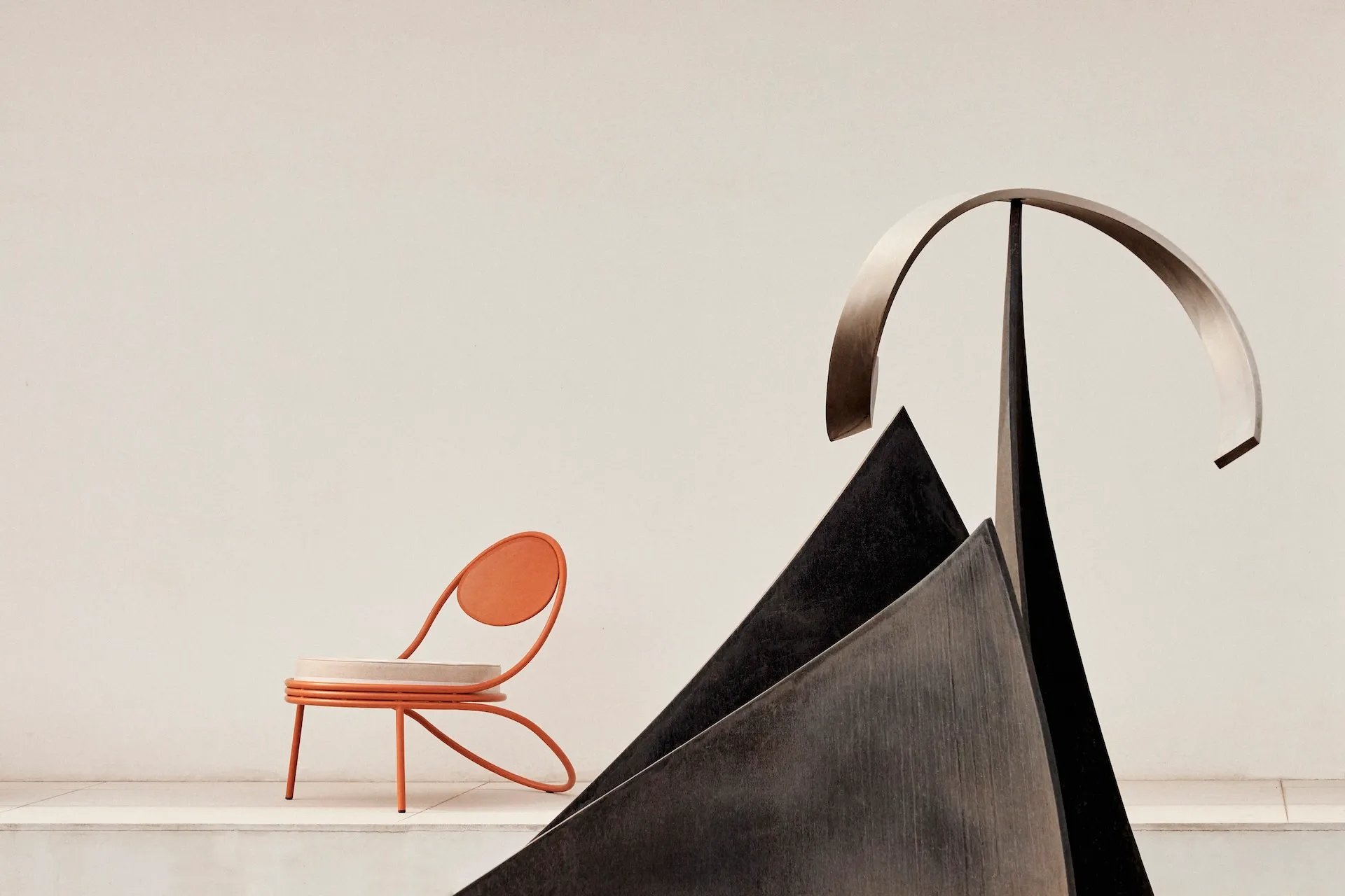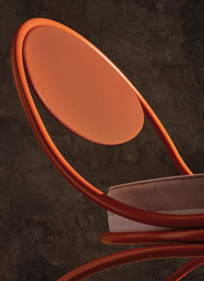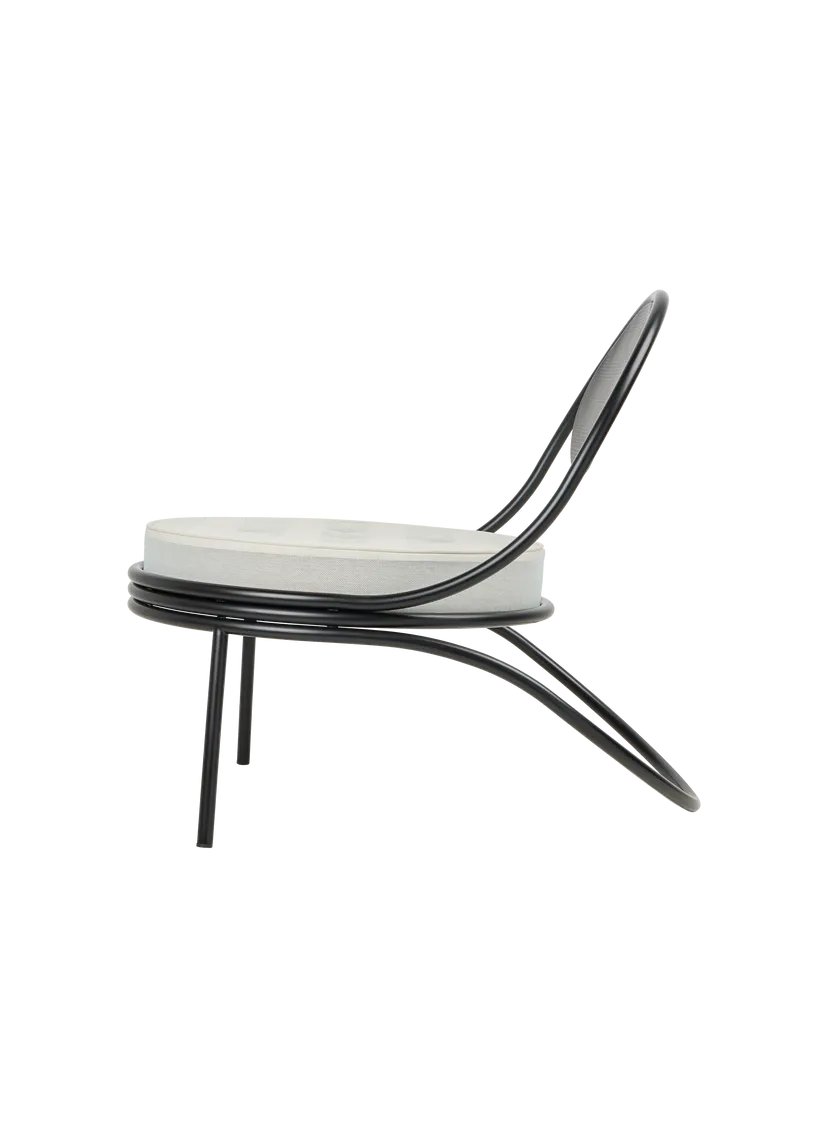 The Copacabana Lounge Chair was created in 1955 by Mathieu Matégot. The low Copacabana Lounge Chair has the impression of being designed with a single pencil stroke and the elegance of the chair resides in the continuous force of the line. It is constructed on the basis of a curved tubular frame that surrounds the round seat and the back made of the perforated metal Rigitulle sheet that often signifies the work of Matégot, ending with the continuous rear legs. The lounge chair, available in black and orange frames, is suitable for both indoor and outdoor use, depending on the fabric upholstery of the seat cushion.