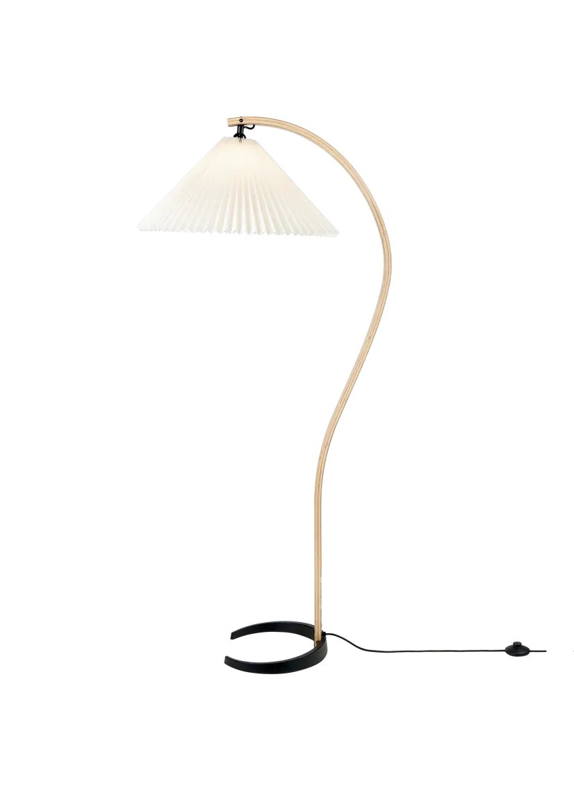 With its playful expression, sinuous organic form, and juxtaposition of natural materials, the Timberline Floor Lamp makes a head-turning sculptural feature in any room of the house. Designed in the 1970s by Mads Caprani, it was visually distinct amongst its peers, and swiftly became an international sensation. The carefully considered design, such as the inset cord and adjustable direction shade, show Caprani's attention to quality and detail. The lamps natural materials - oak, birch, canvas, and cast-iron - and neutral color palette make it complimentary to any style of interior.