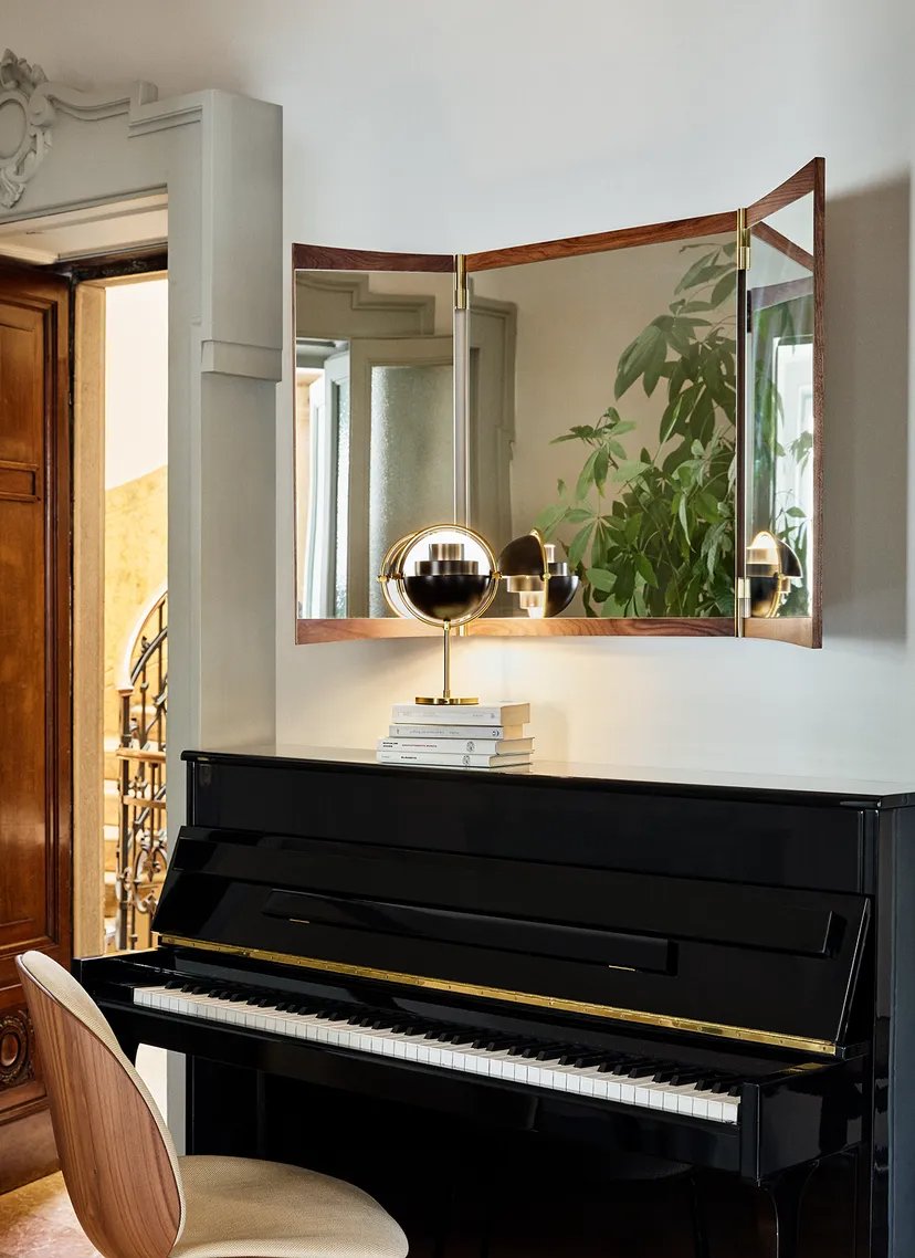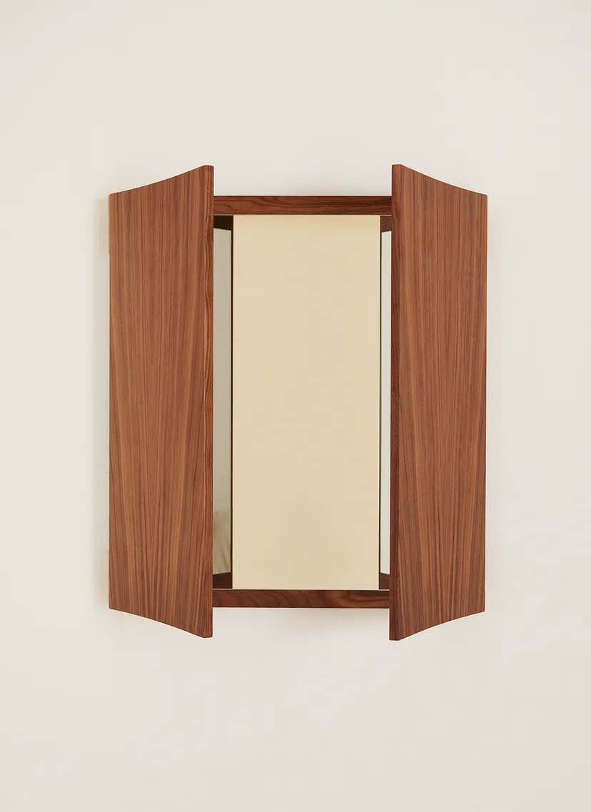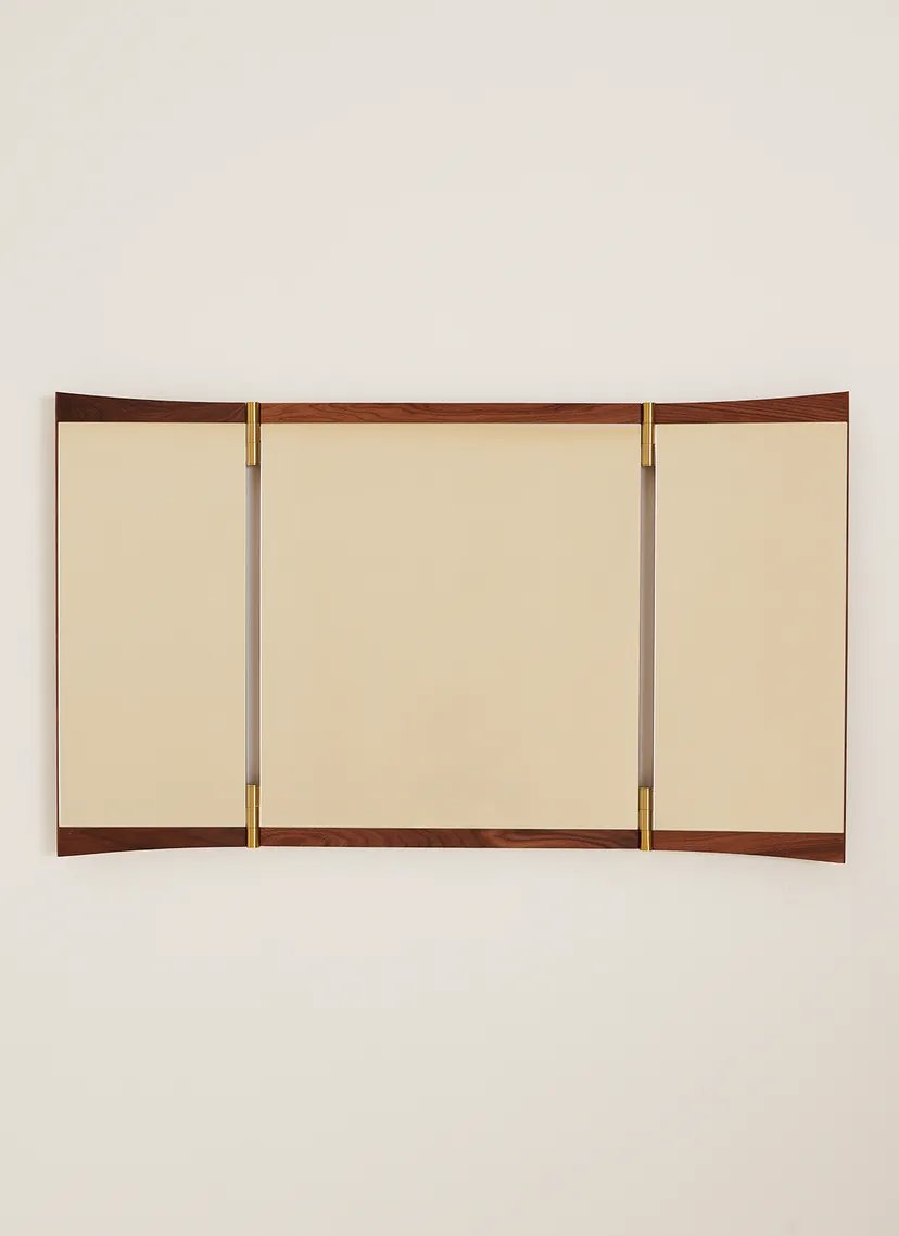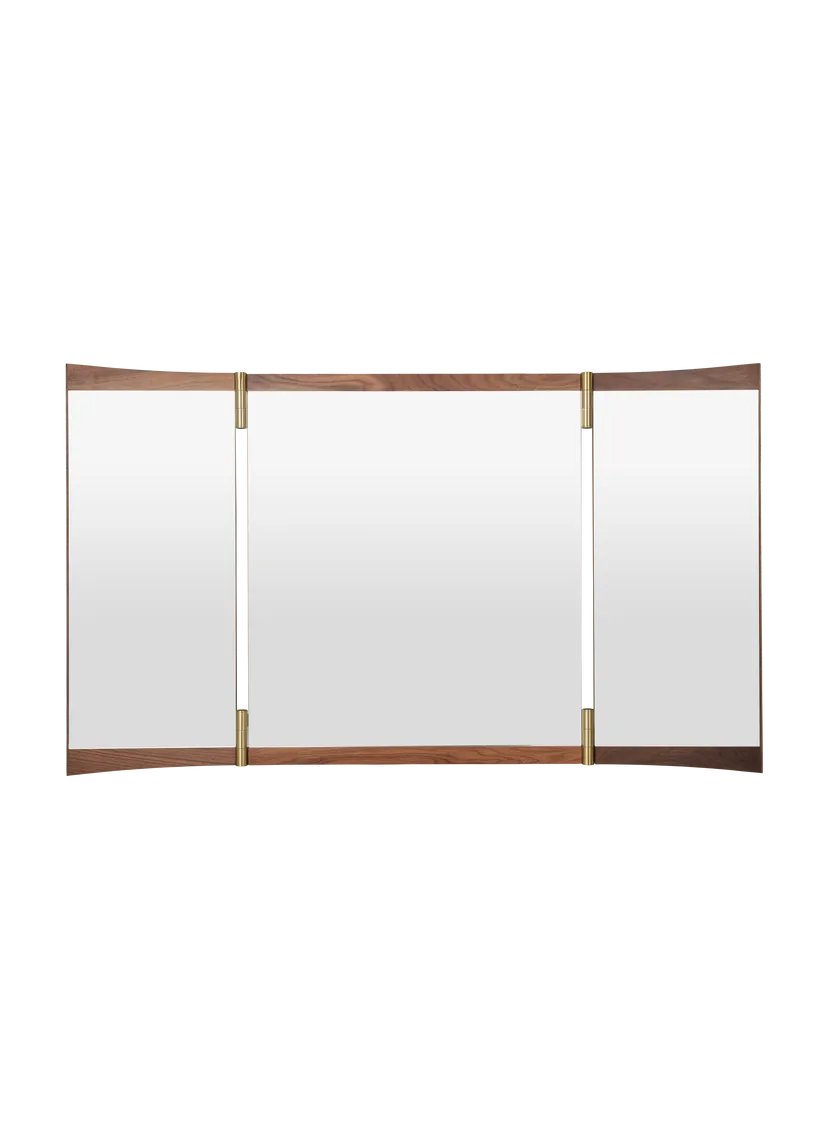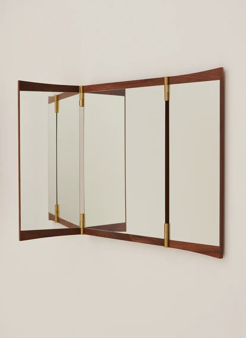 A contemporary echo of the 18th-century vanity-table mirror that gives it its name, the Vanity Mirror Collection is GamFratesi’s second wall-mounted mirror design for GUBI. The collection comprises three variations – with one, two and three mirror panels, respectively. The design’s defining features are its warm walnut veneer and brass hinges. These allow the angle of the mirror to be adjusted, influencing the perspective it offers and the play of the light in the room. On the single-panel Vanity Mirror 1, the hinges permit a 15o rotation, whereas the 180o hinges on the Vanity Mirror 2 and Vanity Mirror 3 allow the panels to fold flat on top of one another, covering the mirror when not in use.