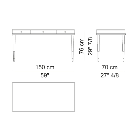 Desk with lacquered top. Lacquered solid wood and wooden panels structure with satin brass or bronze finish legs ferrules. Drawer runners with Blumotion technology. Buffalo’s blond veined horn Dodo handl