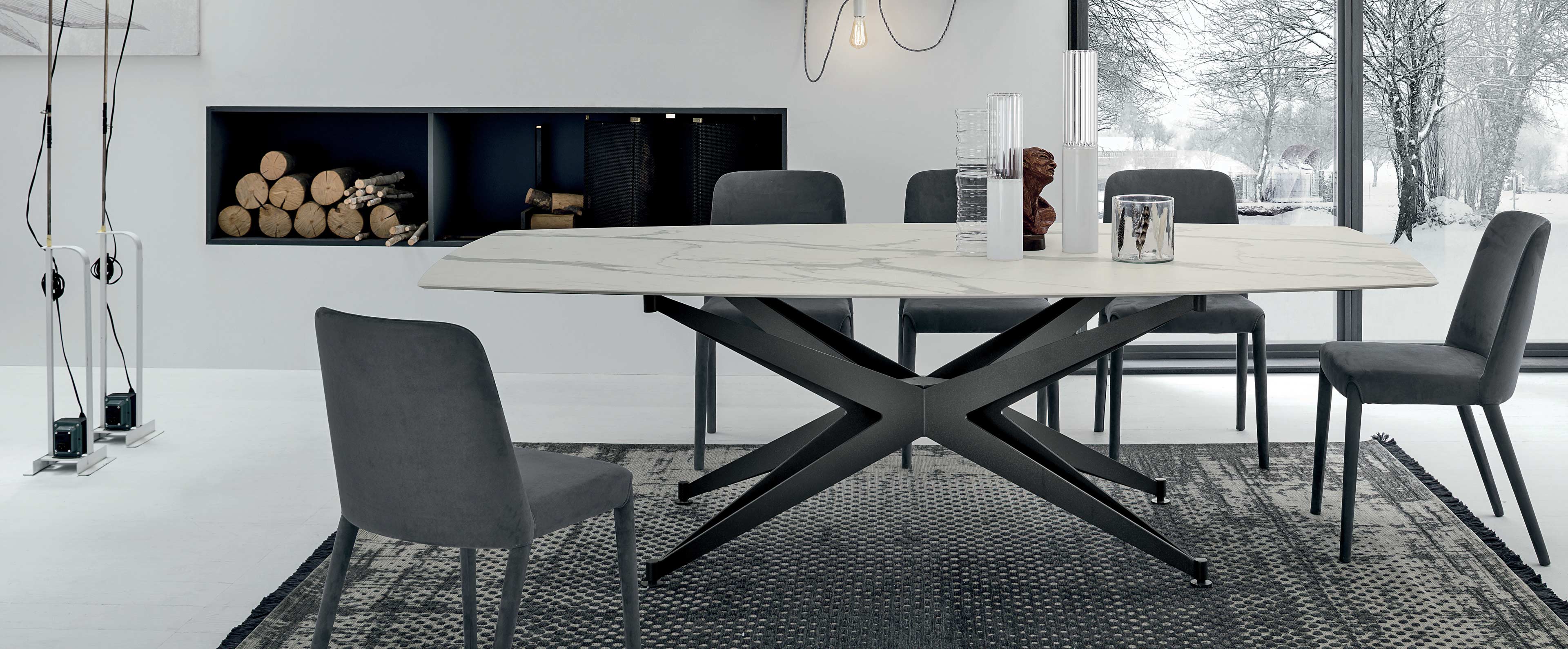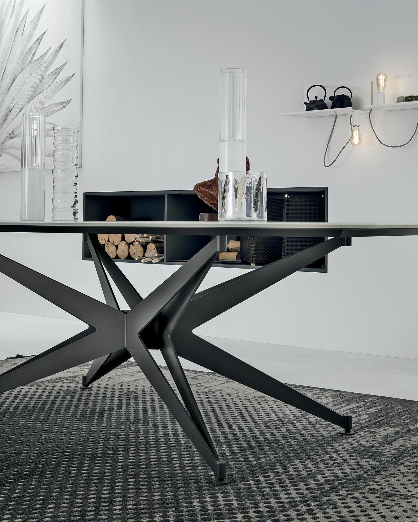 A sculptural table with a solid, star-shaped base that supports the light, plate glass top. A perfect balance of materials and aesthetics.