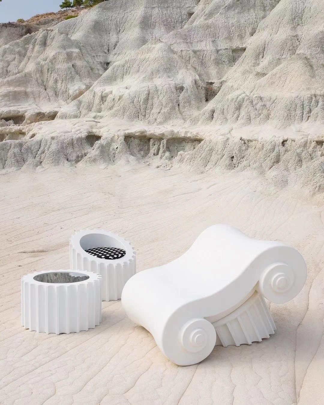 La seduta CAPITELLO, la poltroncina ATTICA e il tavolino ATTICATL, progettati da Studio 65, nascono dalla "decostruzione" di unatradizionale colonna grecd, dando vita a una serie unica cheemula le varie parti della stessa. Ciascun pezzo vieneartigianalmente realizzato in morbido poliuretano e finito conGuflac? Utra, consentendo un utilizzo sia per interni sia peresterni, conferendo l'aspetto del marmo dal quale trae ispirazione.La tensione tra aspettative e realt?? crea un senso di meraviglia,poiché la morbidezza degli arredi contrasta con la durezza dellapietra.Questa iconica serie pop è stata esposta in prestigiosimusei, tra cui il Louvre e il Metropolitan Museum di New York, erappresenta un interessante esempio di rinascita dalle rovine.