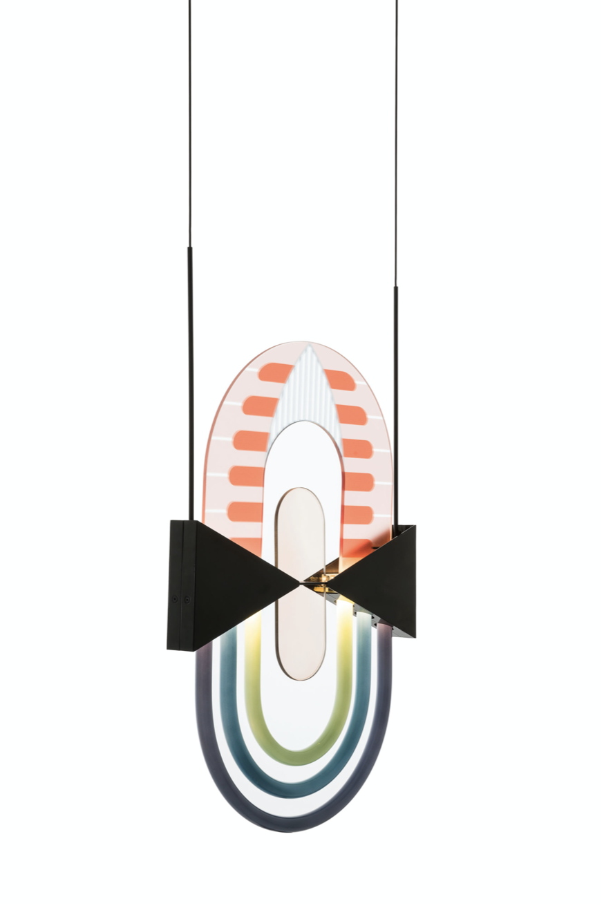 è una lampada a sospensione, sintetica nella sua essenza ma complessa nella sua struttura. La composizione genera inconsapevolmente quell’alito di opulenza caratteristico dell’art déco americana, richiamata anche dal nome della città che incarna quel movimento stilistico. MIAMI è il perfetto connubio tra elementi metallici e vetro decorato, che intrecciandosi fungono da anima e corpo delle lampade stesse, generando un perfetto equilibrio tra estetica e funzione.