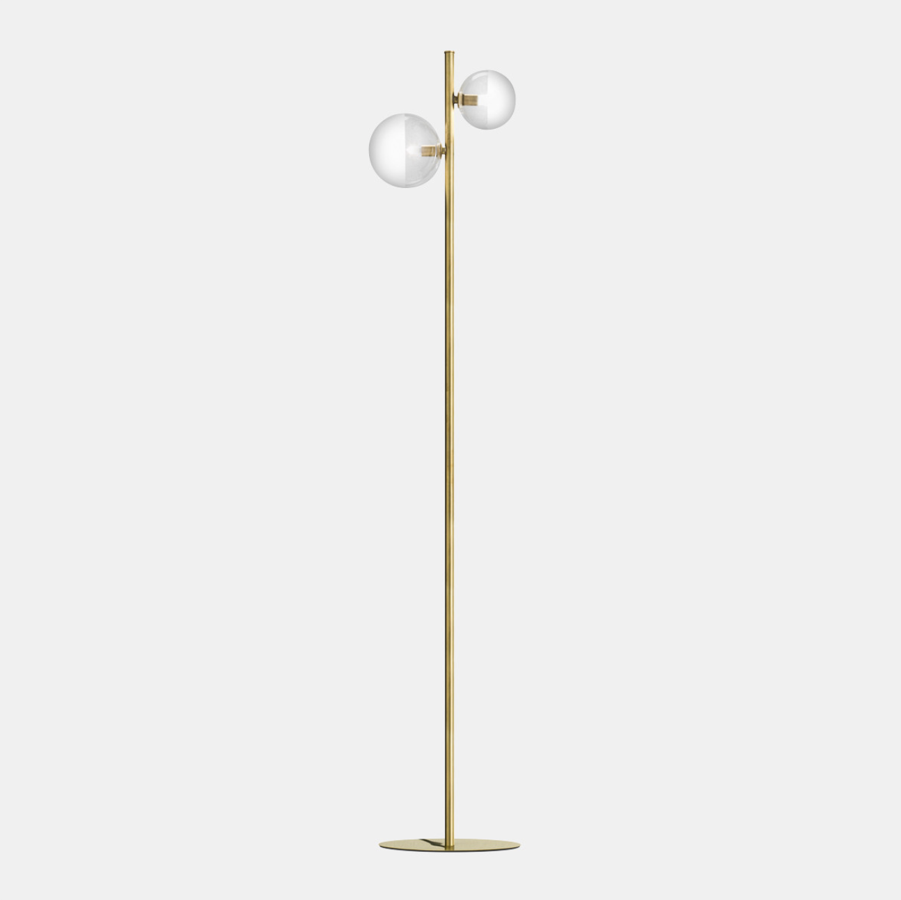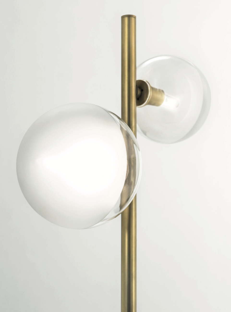 La collezione Molecola si compone di sospensione, piantana, plafoniera, applique e lampada da tavolo. Disponibile nelle versioni in ottone naturale (codice ONT) o ottone anticato (codice OOT) con sfere di vetro trasparente e sabbiato o in ottone verniciato nero e sfere di vetro ramato (codice NNR).