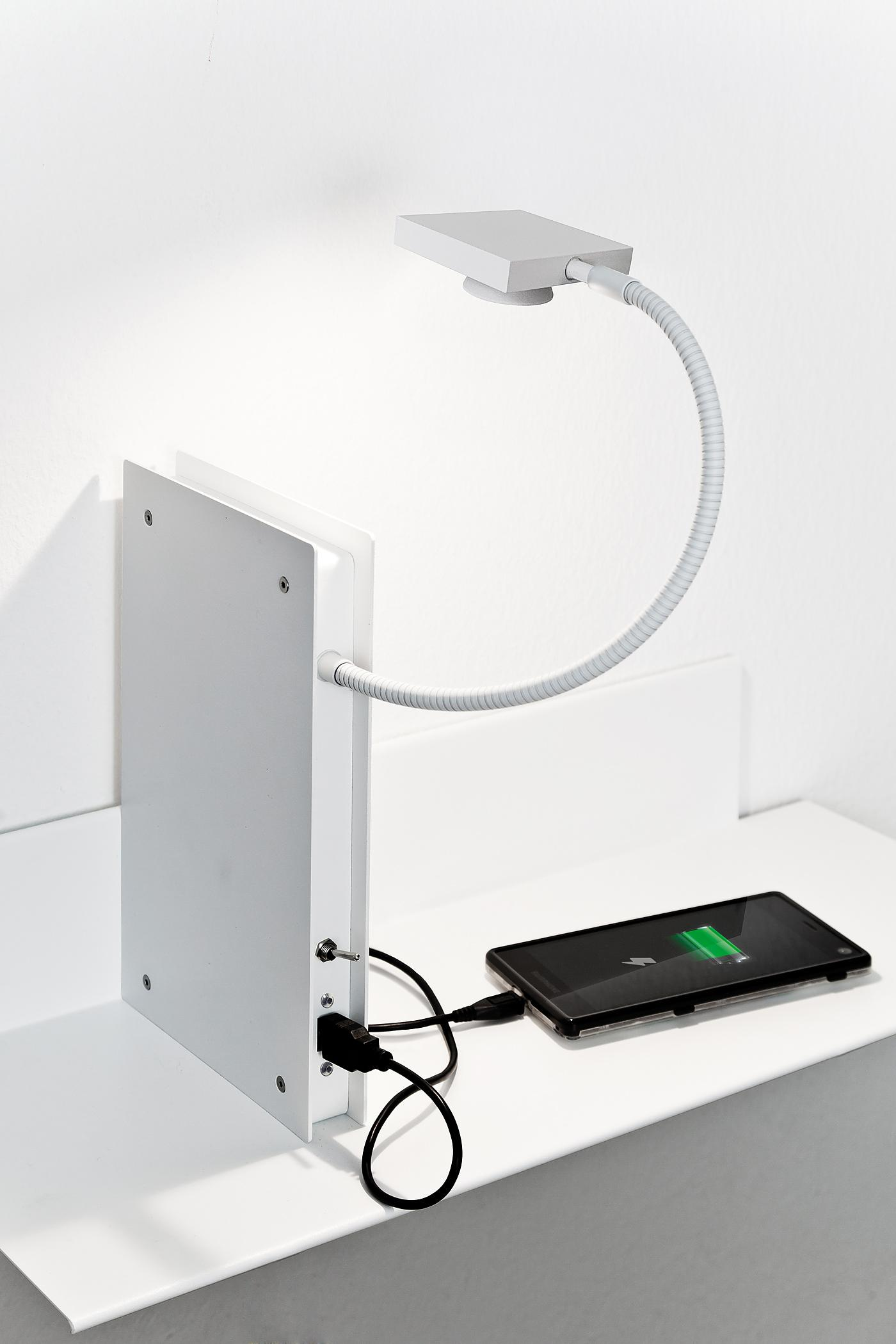 The body of the lamp serves as bookend. The flexible metal arm allows variable adjustment of the lamp head. Anodised aluminium in black or silver, metal.