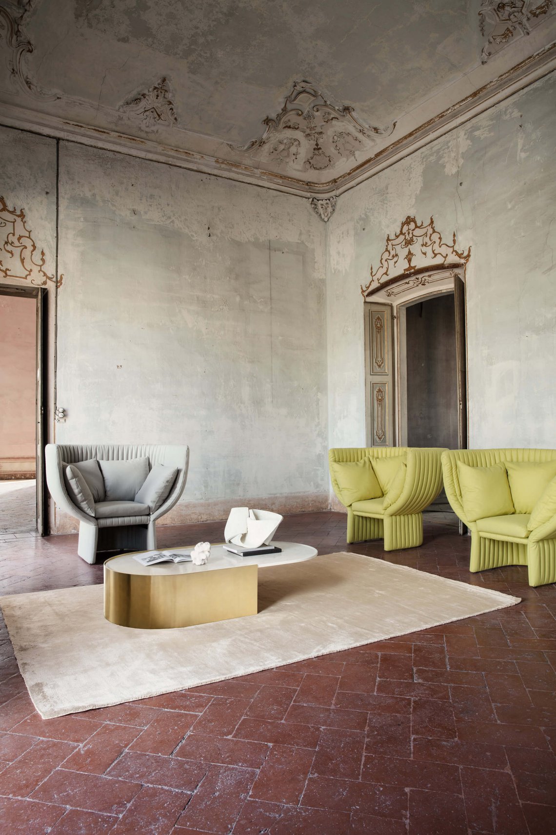 The thickness of the quilted padding and the fabric cover foster a feeling of sound isolation so Ghisolfa are ideal for informal meetings and conversations in total comfort. A low version more suitable for group meetings or conversation areas is also available.