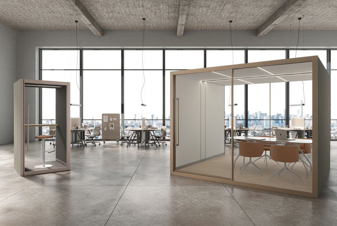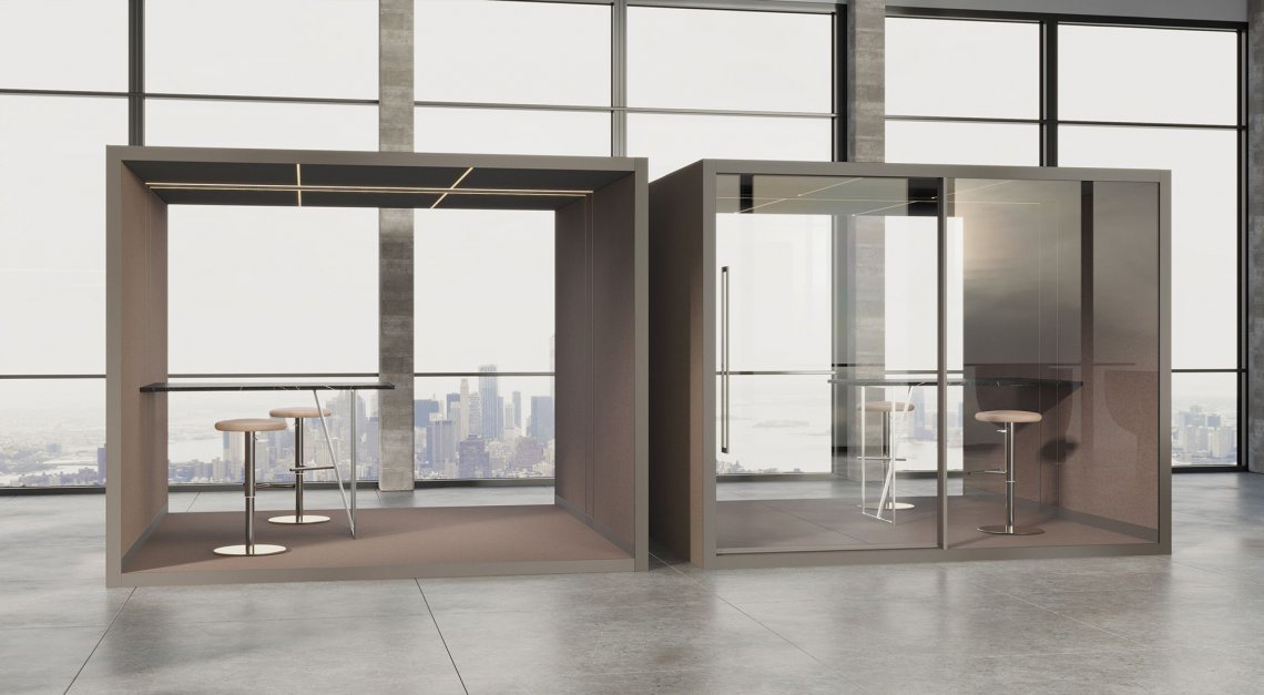 The meeting room version can accommodate tables for meetings or conference calls, monitors and whiteboards.