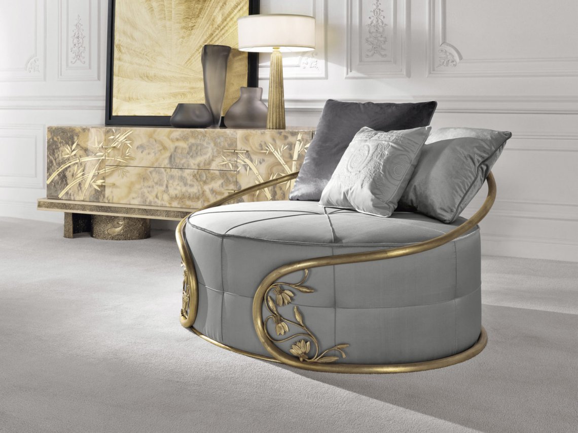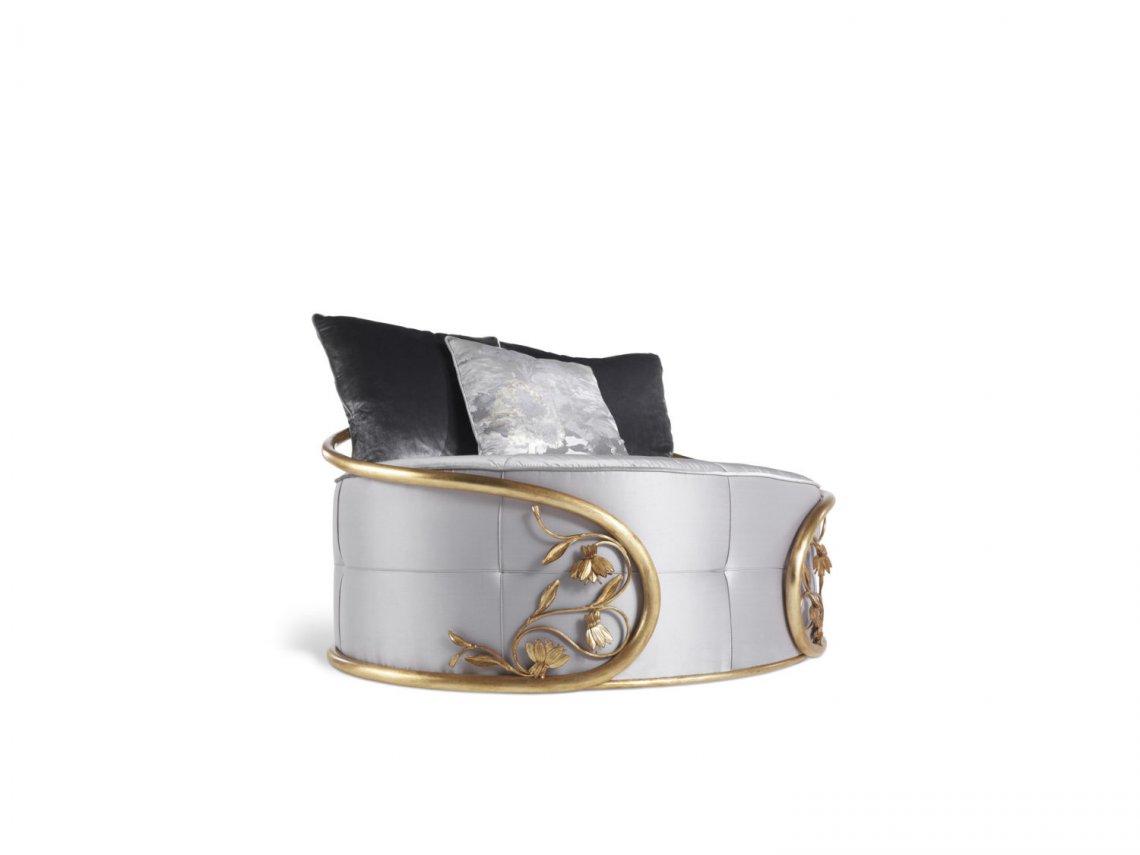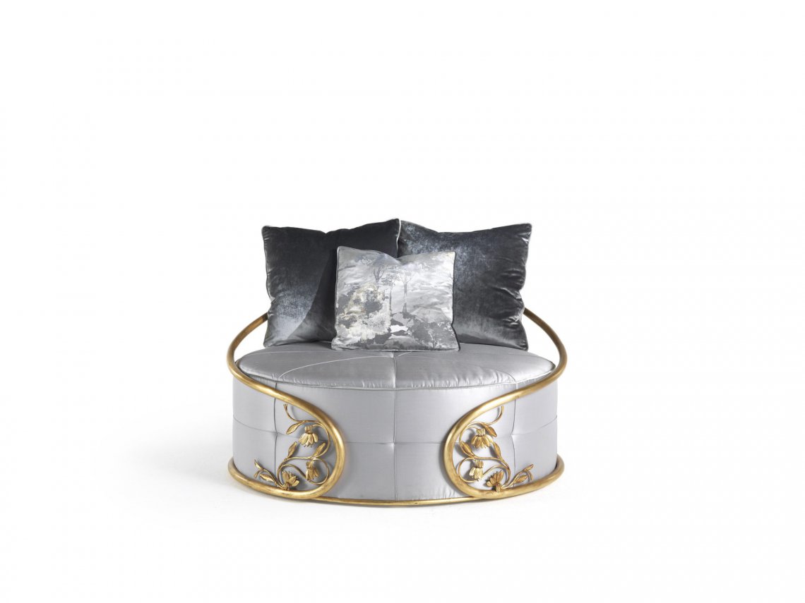 ARMCHAIR WITH STRUCTURE IN IRON WITH PATINATED ANTIQUE GOLD FINISHING. PADDING IN FOAM. UPHOLSTERY IN FABRIC. BACK CUSHIONS IN FABRIC (60X60 CM AND 50X50 CM).
