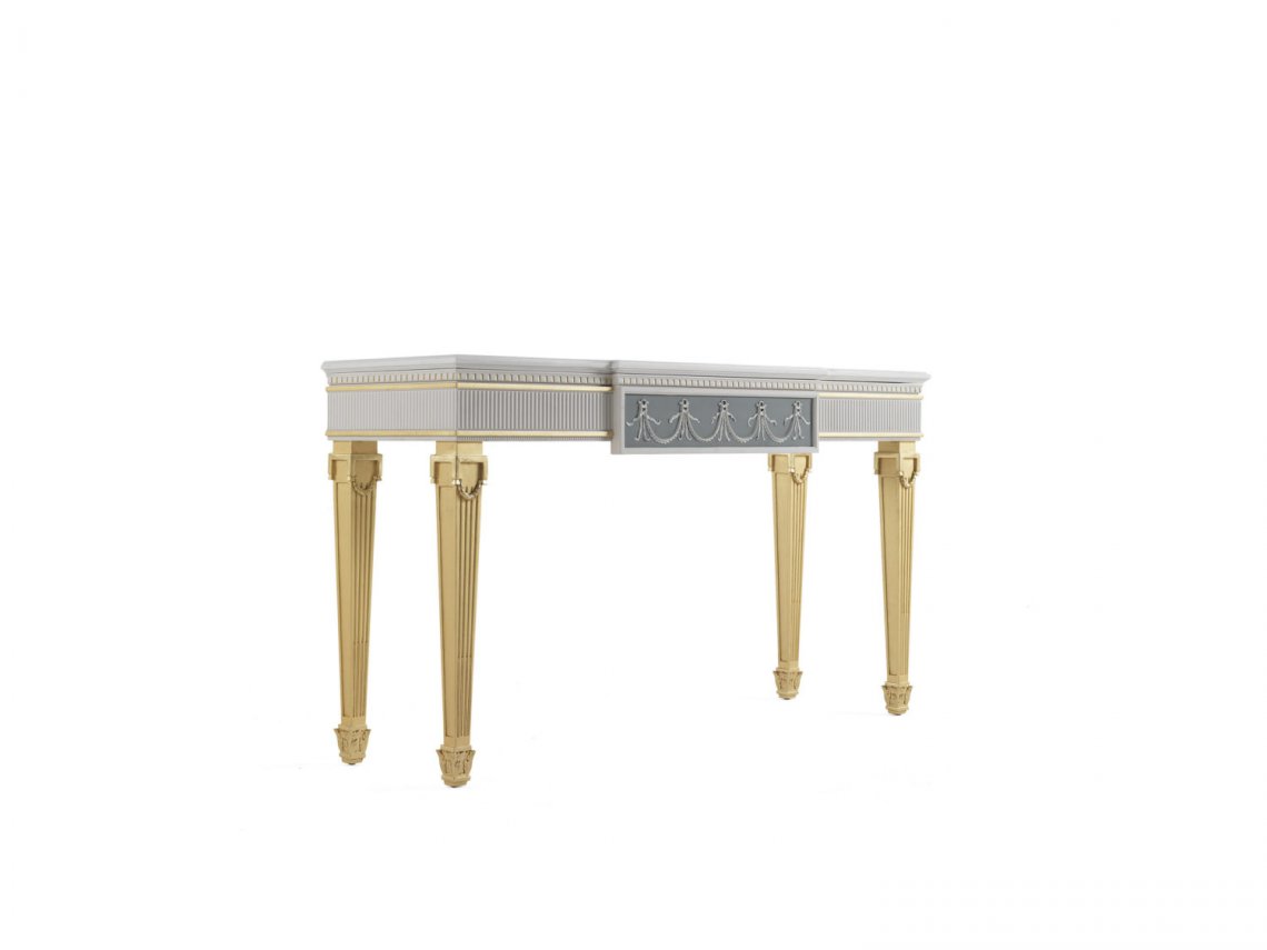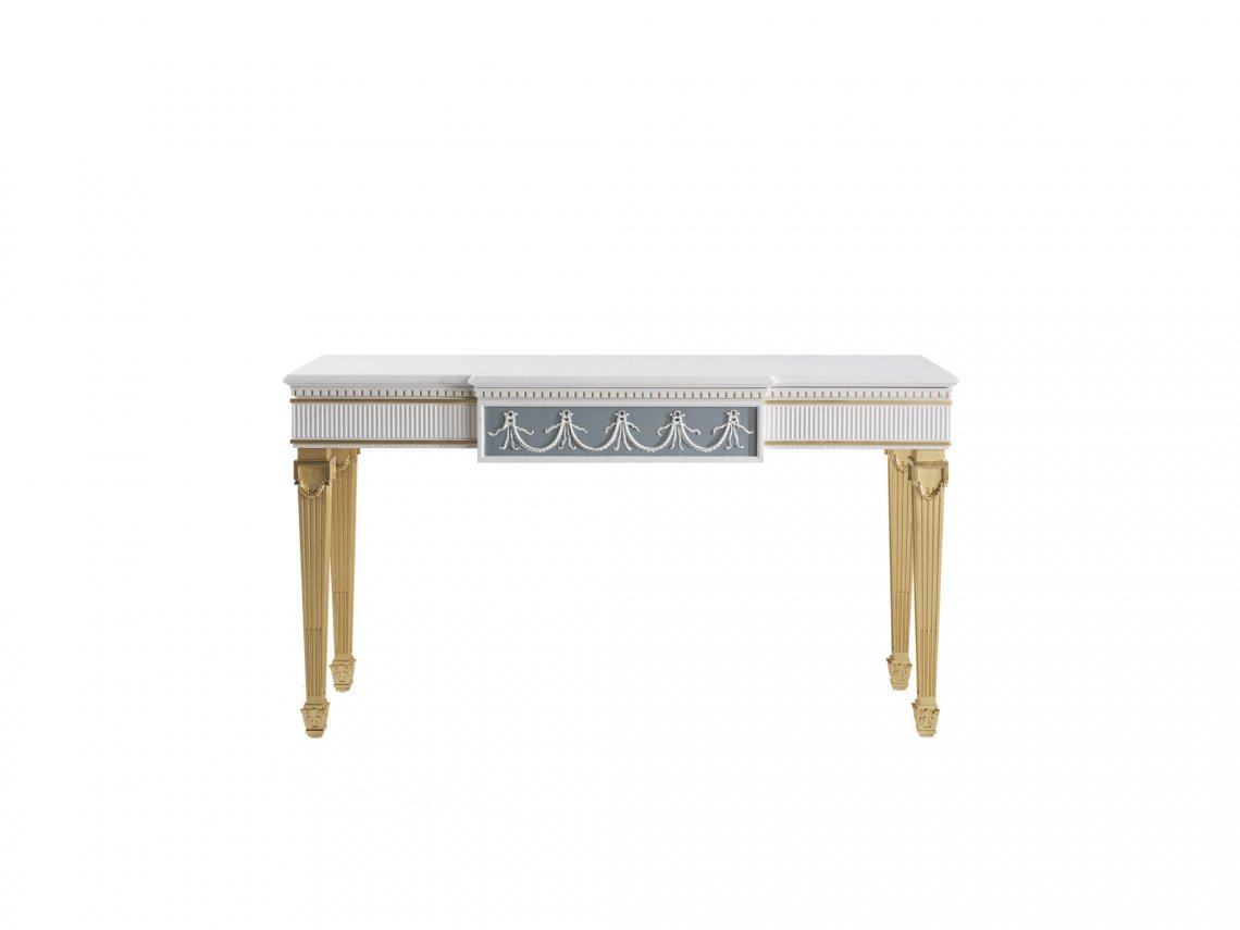CONSOLE WITH STRUCTURE IN SOLID BEECHWOOD. DECORATIONS IN STYLE OF WEDGWOOD CERAMIC. WHITE AND GREY LACQUERED FINISHING WITH BISCUIT PORCELAIN EFFECT AND MATTE AND SHINY GOLD LEAF FINISHING. TOP IN WHITE STATUARIO MARBLE.