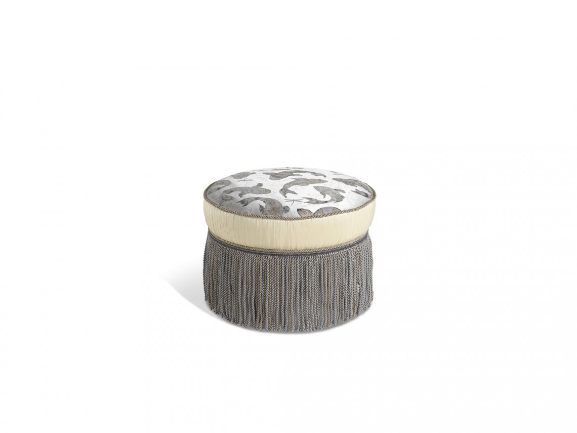 Pouf with structure in beechwood. Padding in foam. Upholstery in fabric. Decorative fringe.