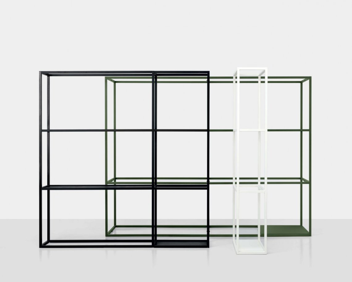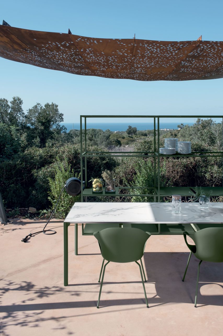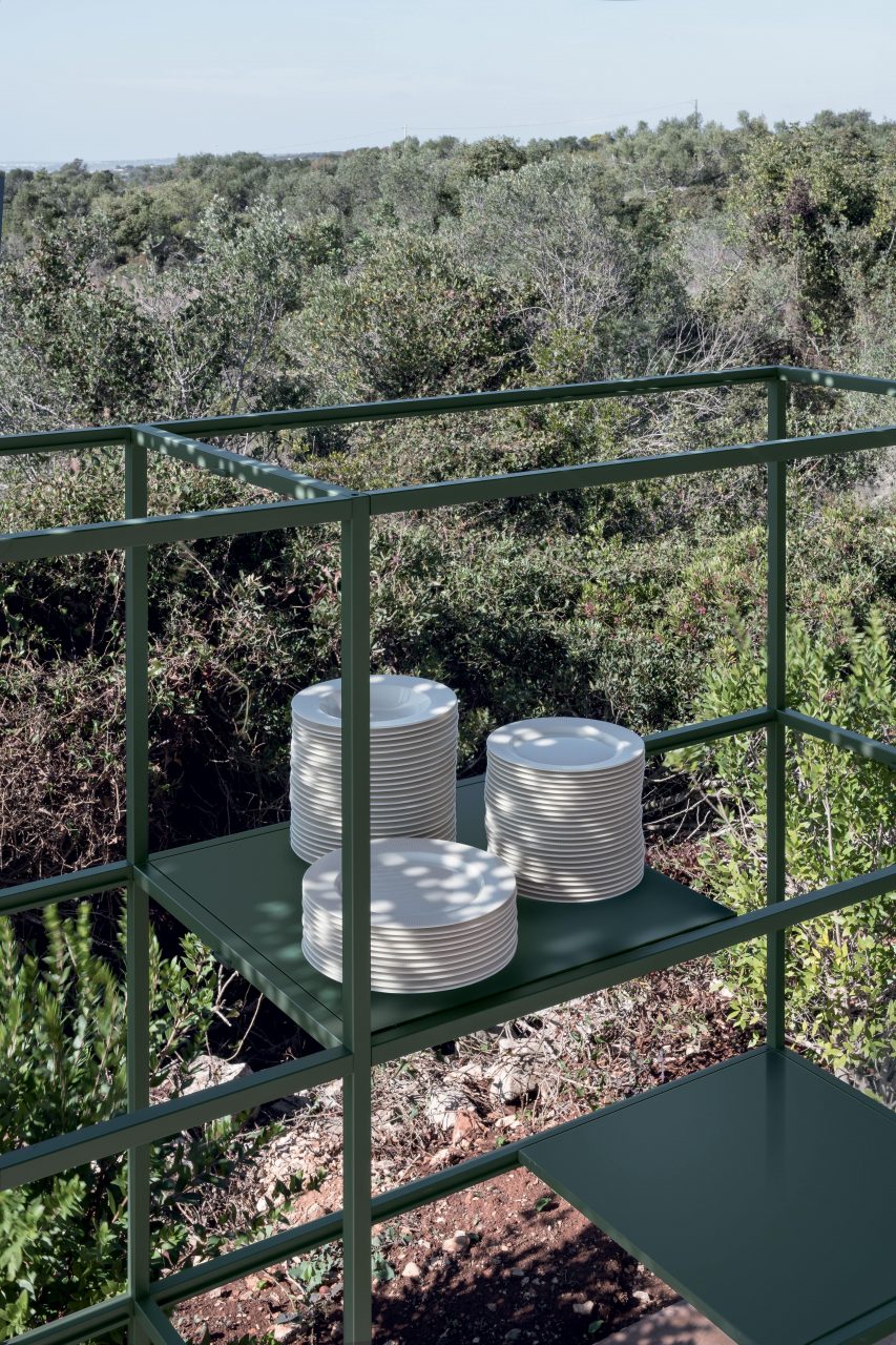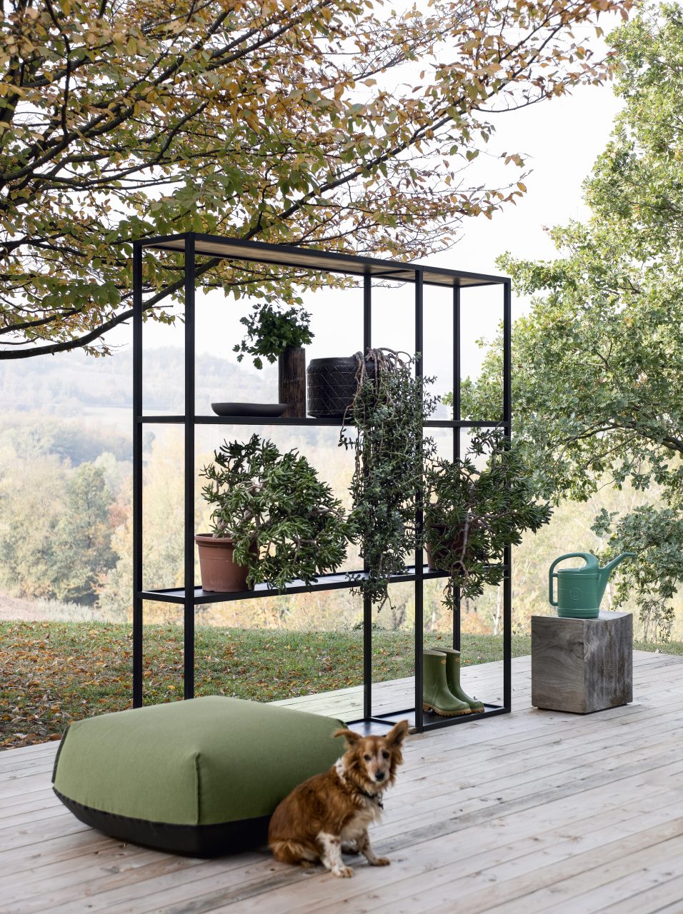 Designed for versatile outdoor use, Regoli shelves have a minimalist design that blends harmoniously into any context. Made of sturdy cataphoresis-treated metal, with a layer that protects against rust and weathering and a subsequent powder coating, it is available in white, black or olive green. Thanks to their modularity, they can be used to create a multitude of solutions, choosing from modules of different widths and depths, always 200 cm high. Even the shelves, either with a grid for the passage of water or solid ones, can be moved as you prefer to meet all needs: for furnishing a patio or terrace, organising a vertical vegetable garden or a collection of plants, storing wood or tools etc.