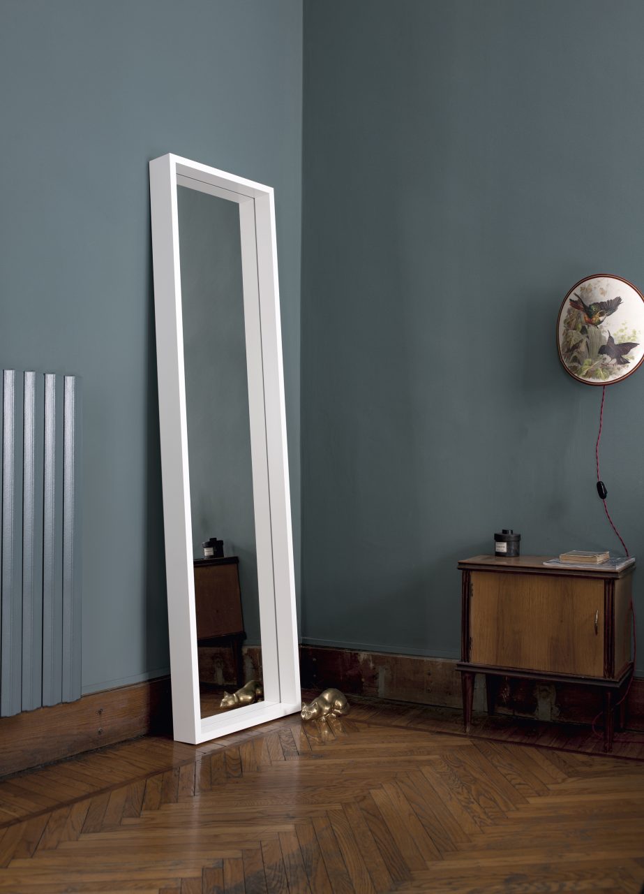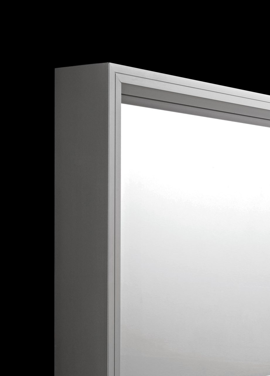 Luciano Bertoncini has designed a collection of large rectangular mirrors to hang on or lean against a wall, thus extending home or community spaces and making them brighter. Available in two heights and four widths, Extra Large mirrors feature a simple geometric thick frame in drawn anodized aluminium or white painted frame. The mirror surface is therefore slightly recessed so as to create an interesting perspective effect. These functional accessories that add a special touch to any context, can be hung vertically or horizontally.
